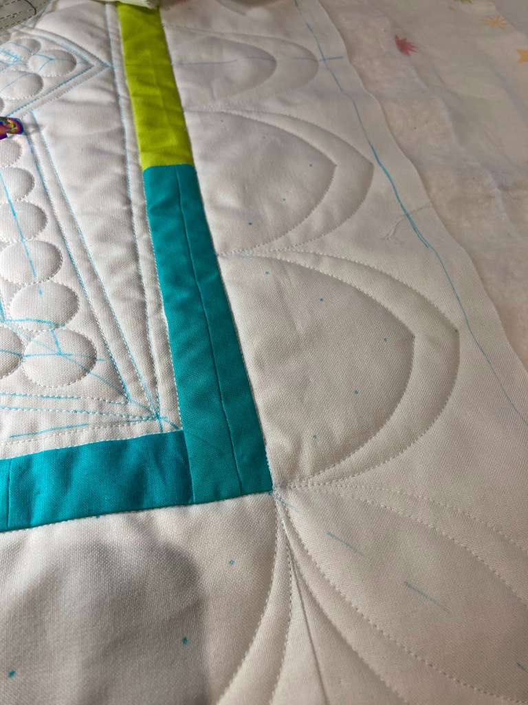 Natuurlijk moeten deze bogen ook opgevuld worden. Eindelijk is het duidelijk waarom deze quilt de Lotus-quilt heet…. De lotusbloemen mogen eindelijk gequilt worden!