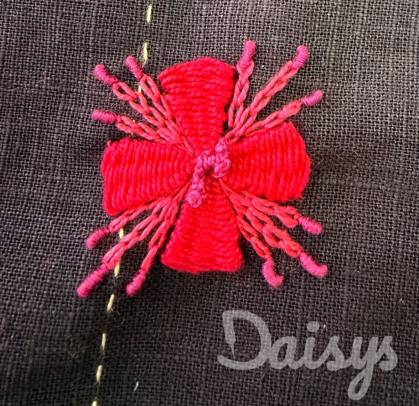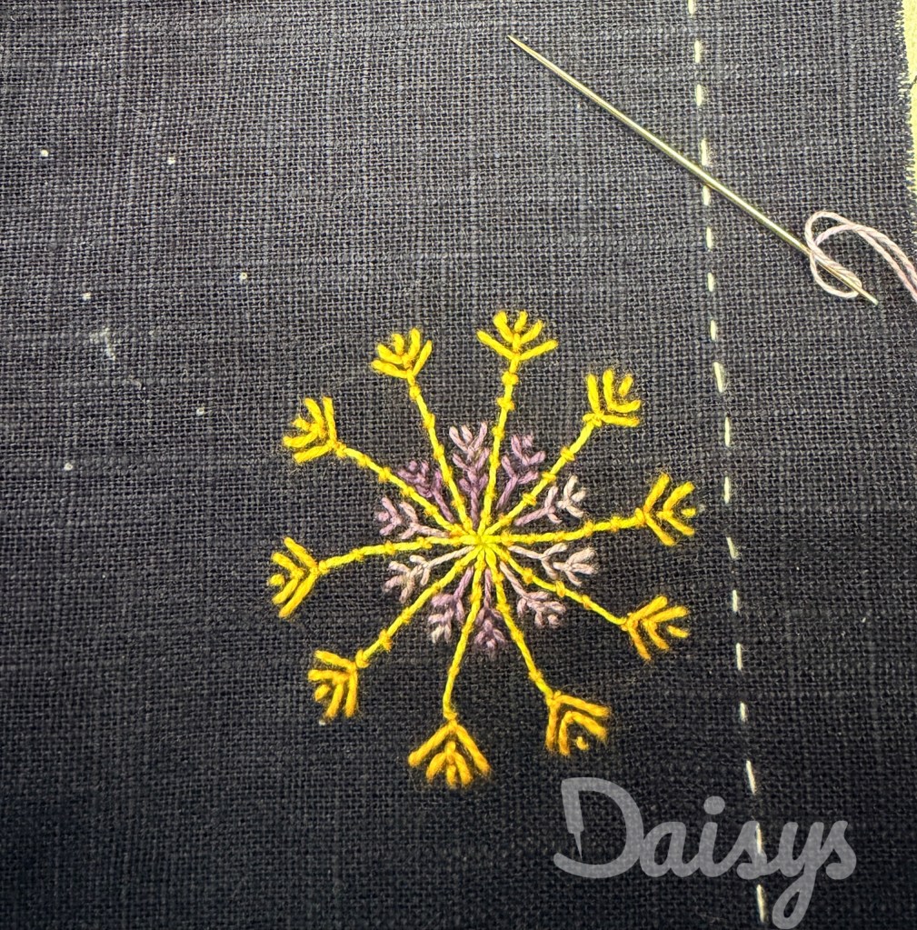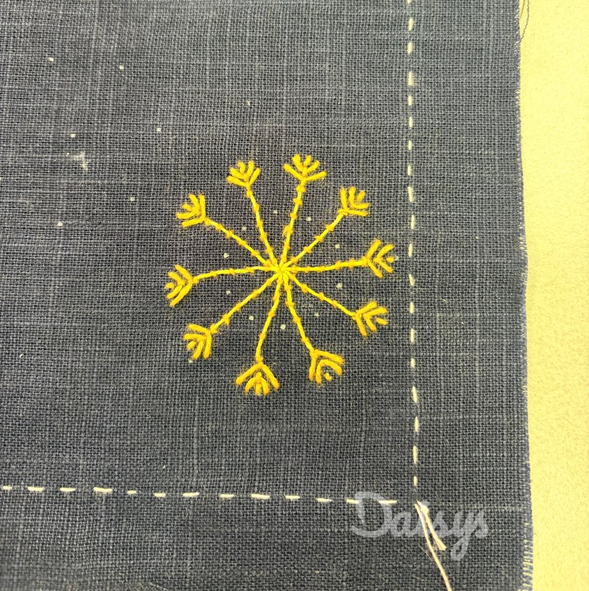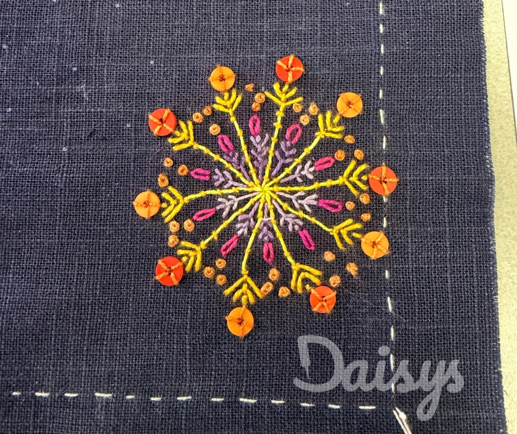 Na een korte uitleg over de Spoke Easy-mallen konden we aan de slag: bloemen aftekenen op de omslag en daarna beginnen met borduren…