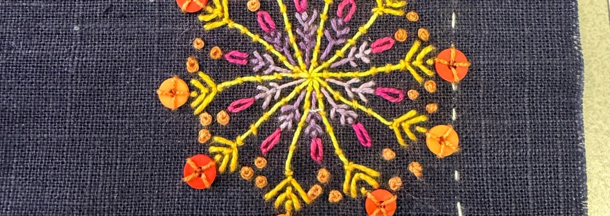 Na een korte uitleg over de Spoke Easy-mallen konden we aan de slag: bloemen aftekenen op de omslag en daarna beginnen met borduren…