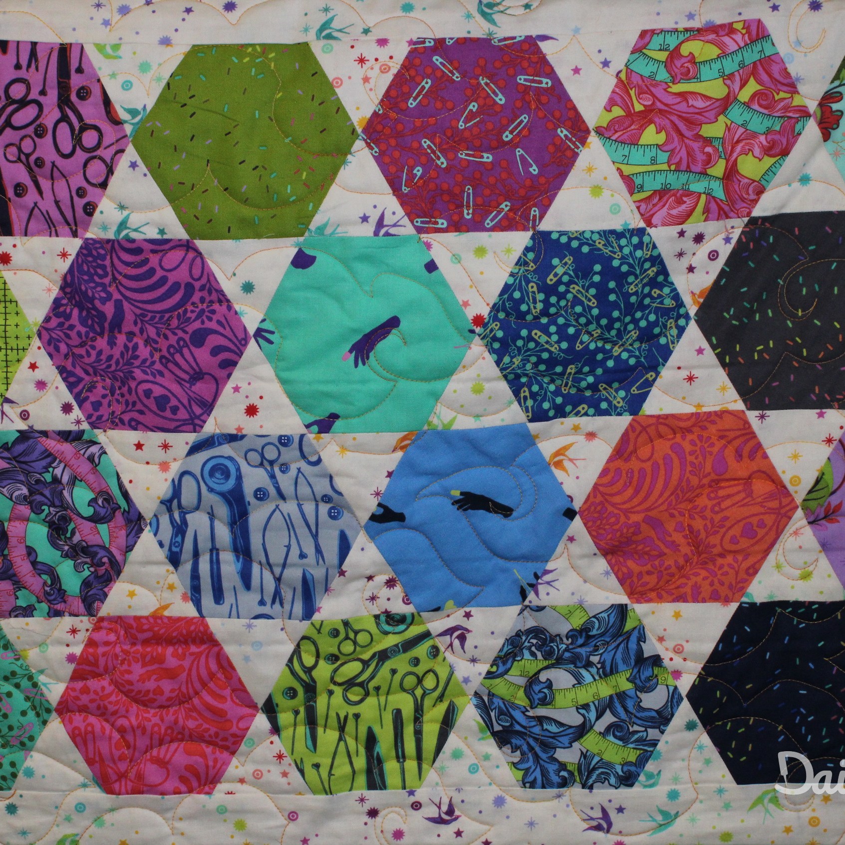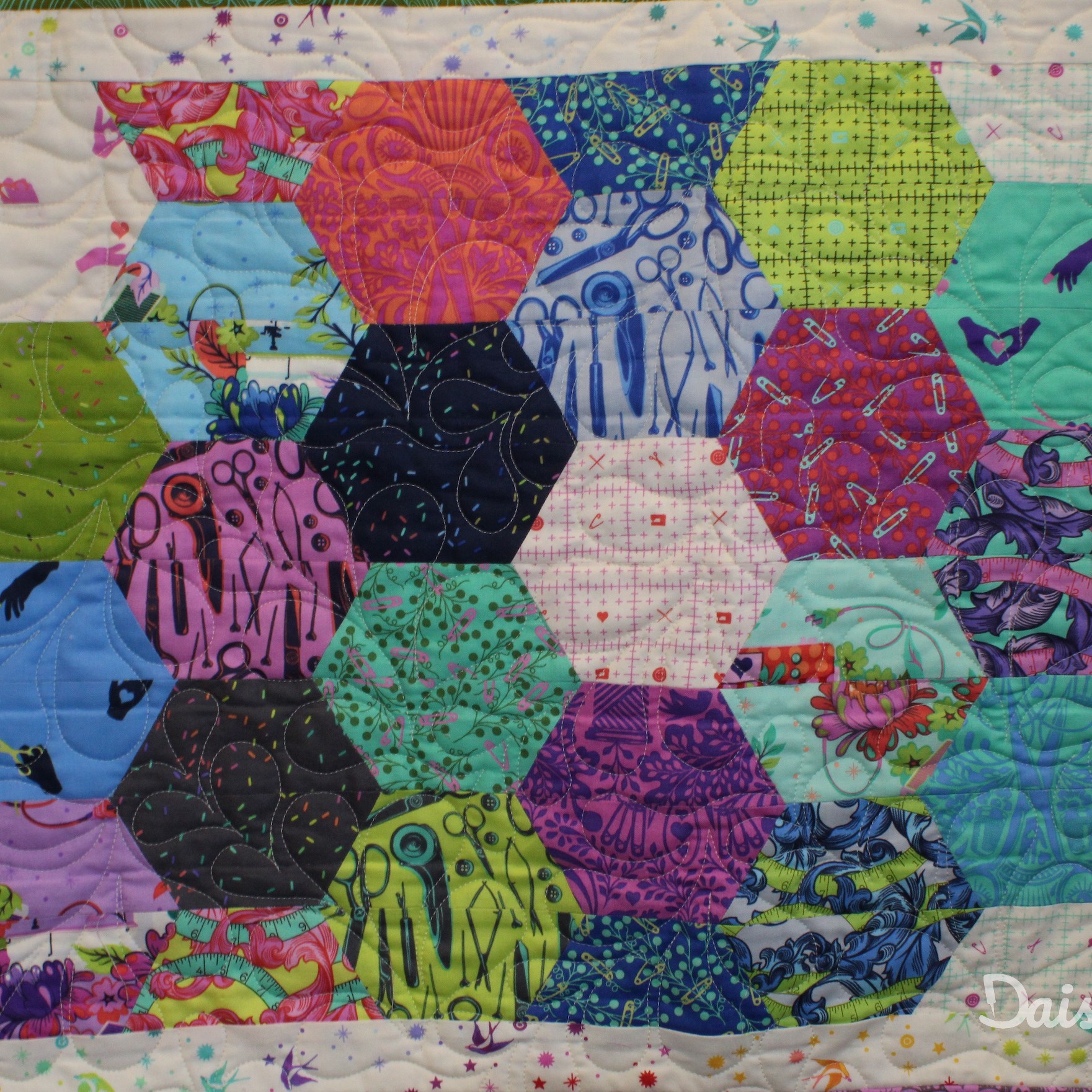 Een quilt die ik gemaakt heb in de stijl van Quilt-as-you-go. Hierdoor heb ik de verschillende blokken op andere manieren gequilt. Elk blok heeft een ander edge-to-edge patroon. De patronen die gebruikt zijn, zijn: