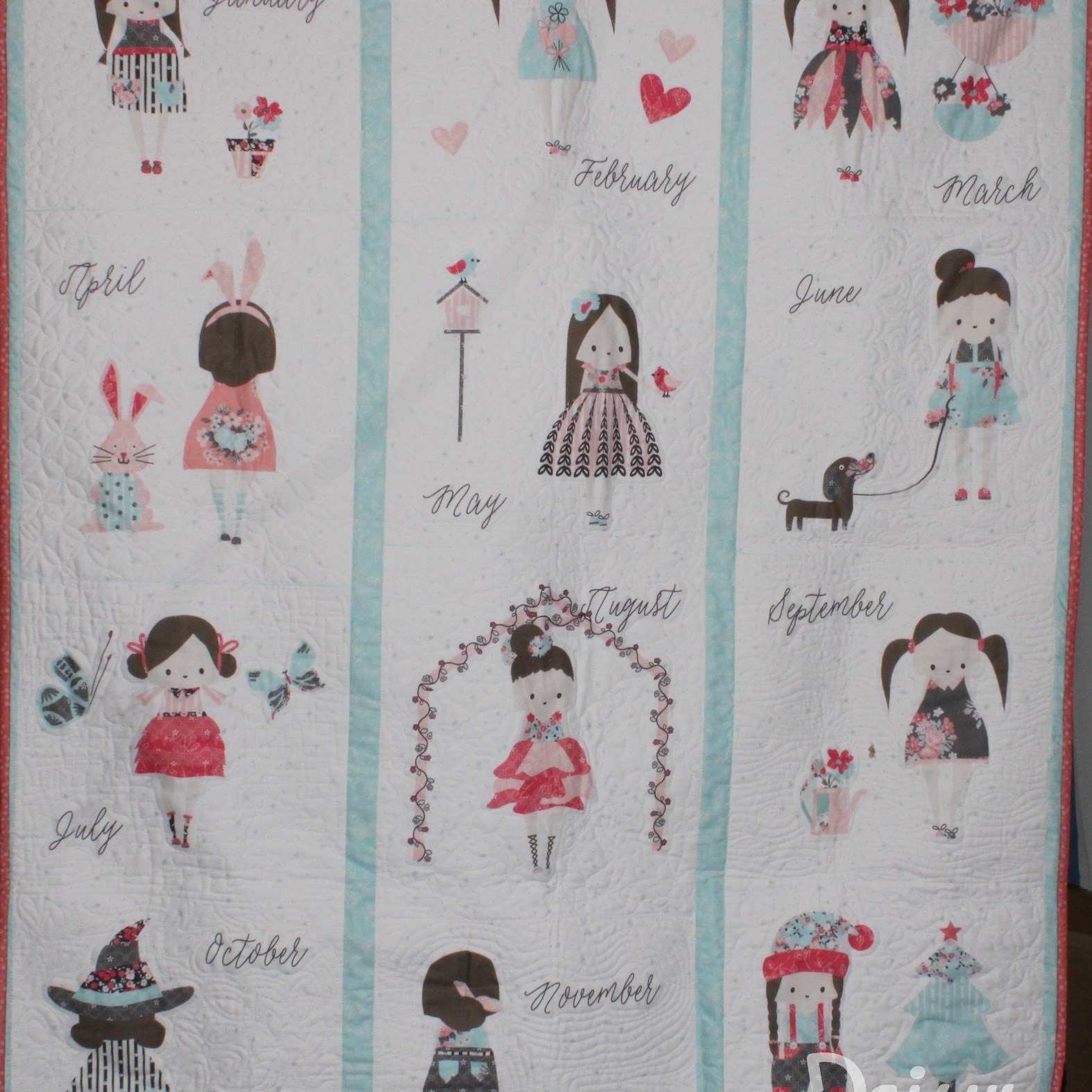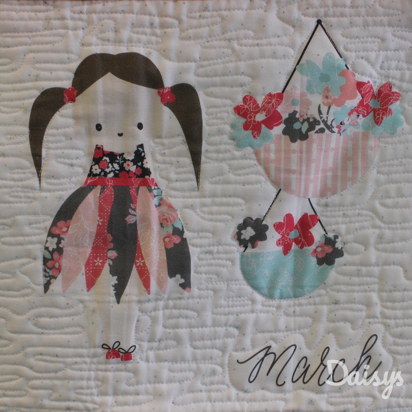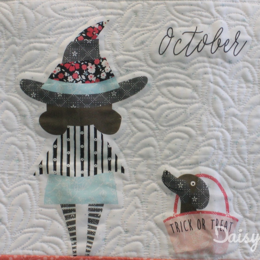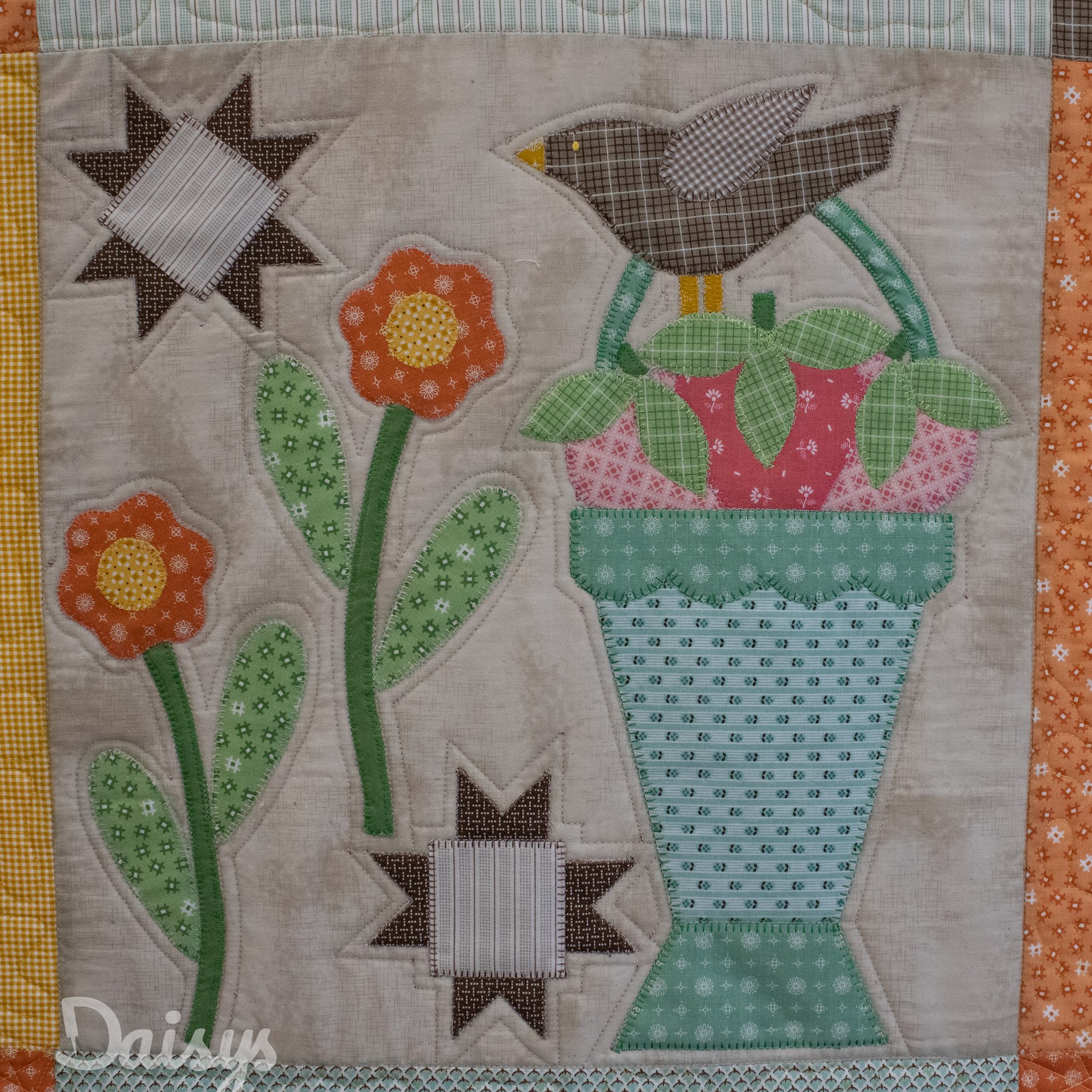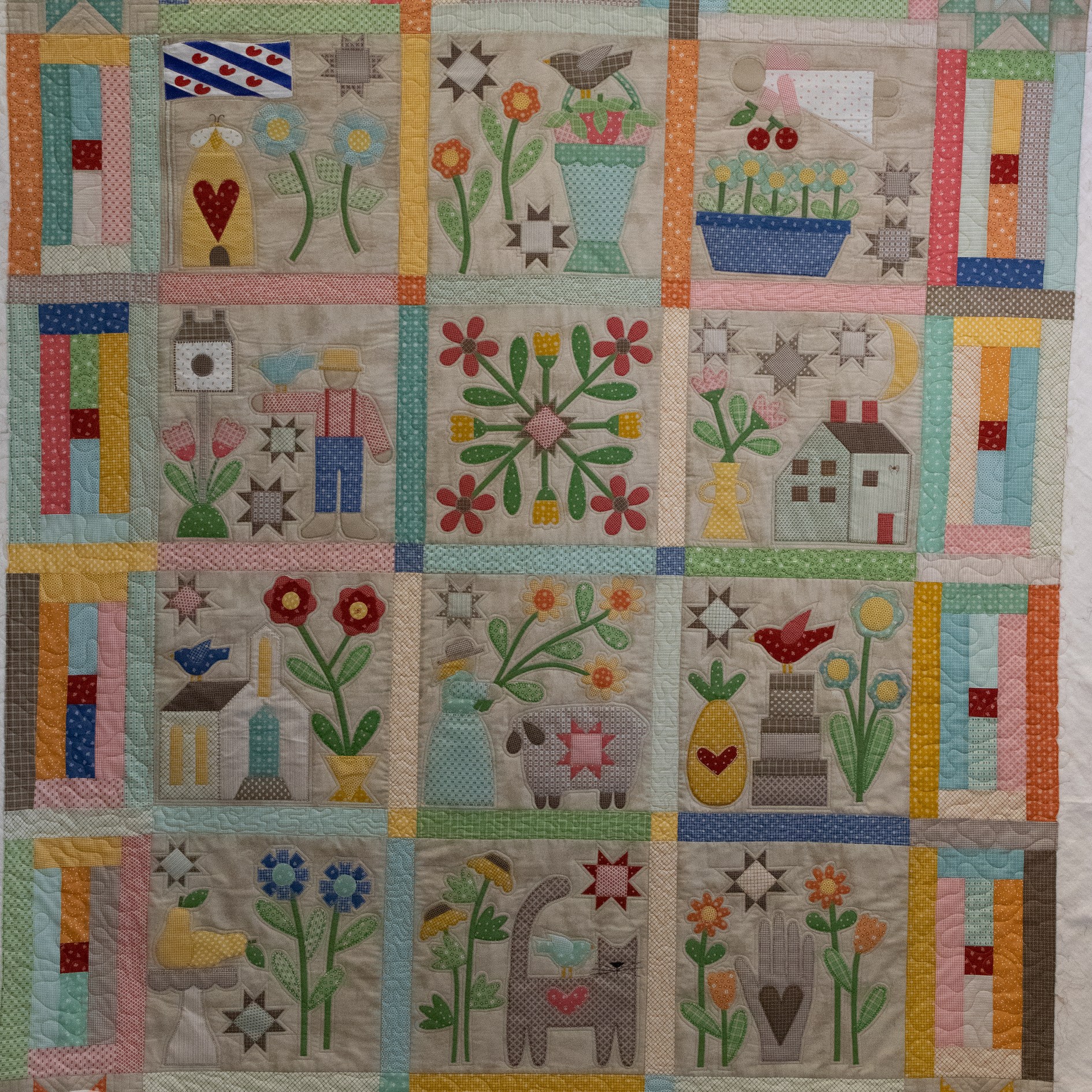 Deze vrolijke applicatiequilt is gemaakt door Jolanda Abbink. Het patroon is ‘Prim’ van Lori Holt en gemaakt van de bijbehorende stoffenserie.