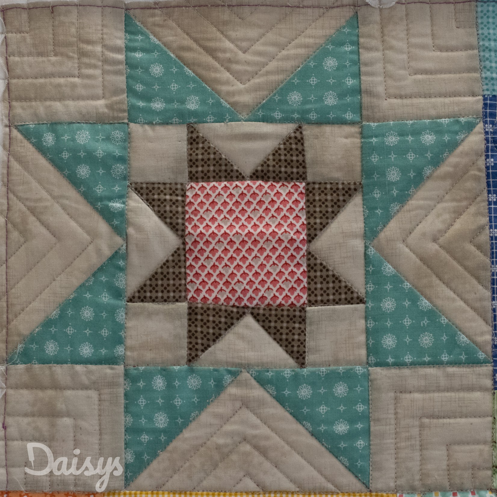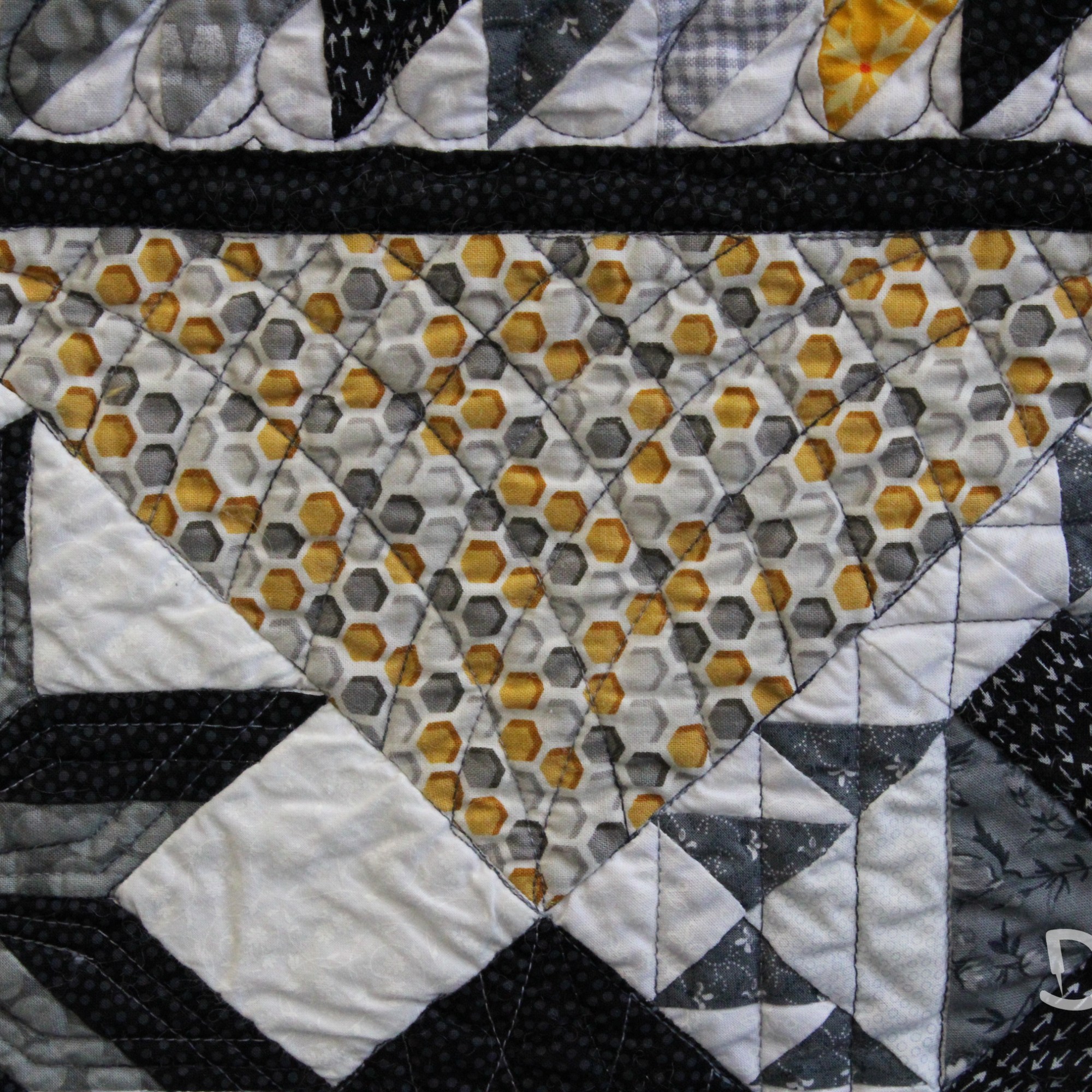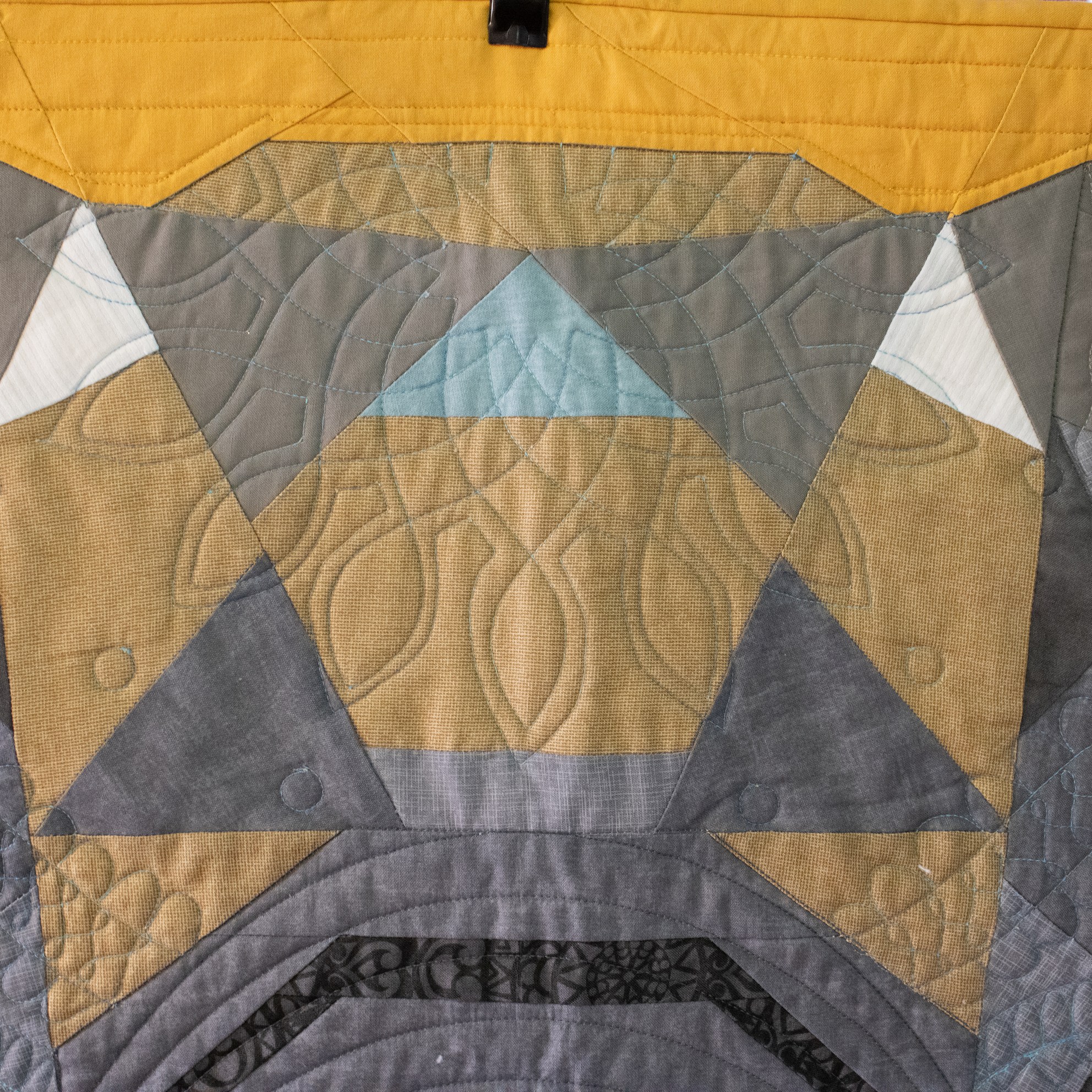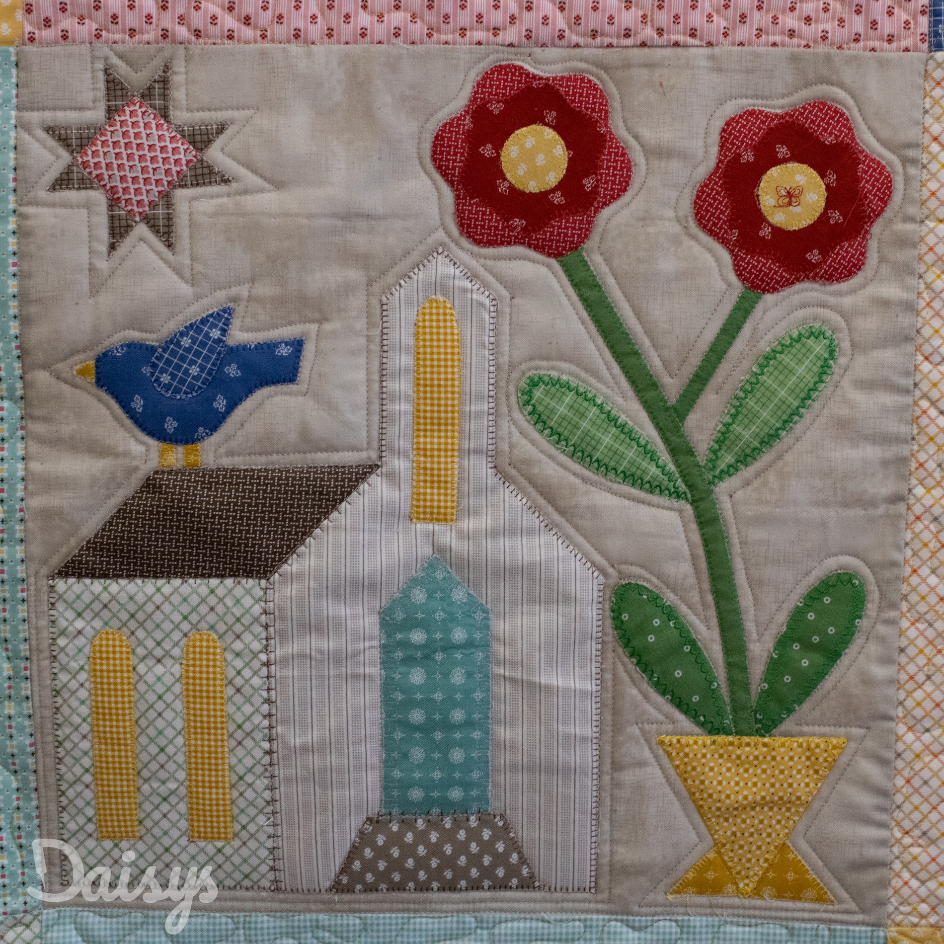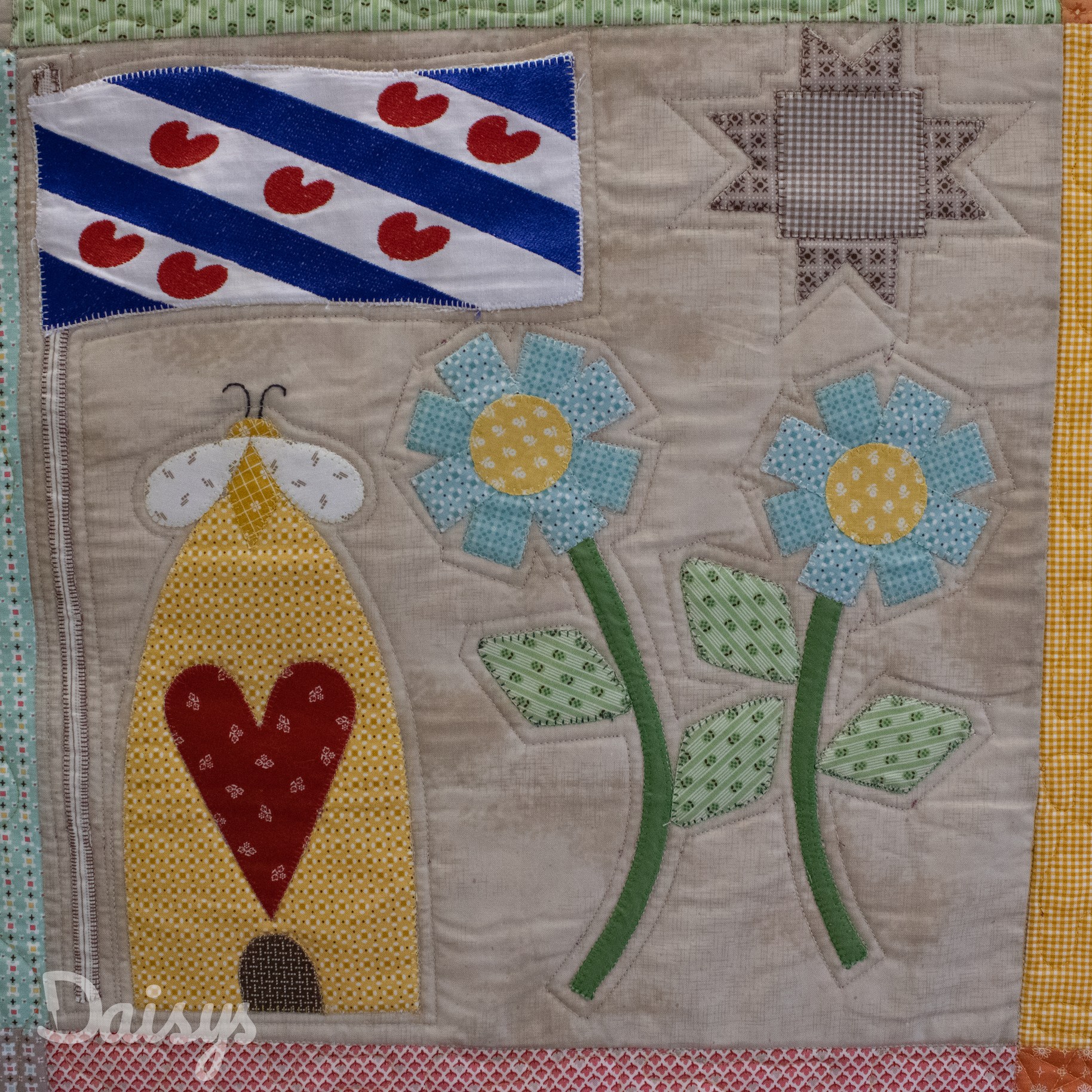 Om de applicaties te benadrukken heb ik direct om de applicaties gequilt, maar ook met een 1/4″ echo eromheen. Daarnaast heb ik in de sashings en de buitenrand een ruime meander gequilt en in de hoekblokken een echo om de ster heen. Om een klein accent te geven aan de kleine cornerstones, heb ik daar kleine sterretjes toegevoegd.