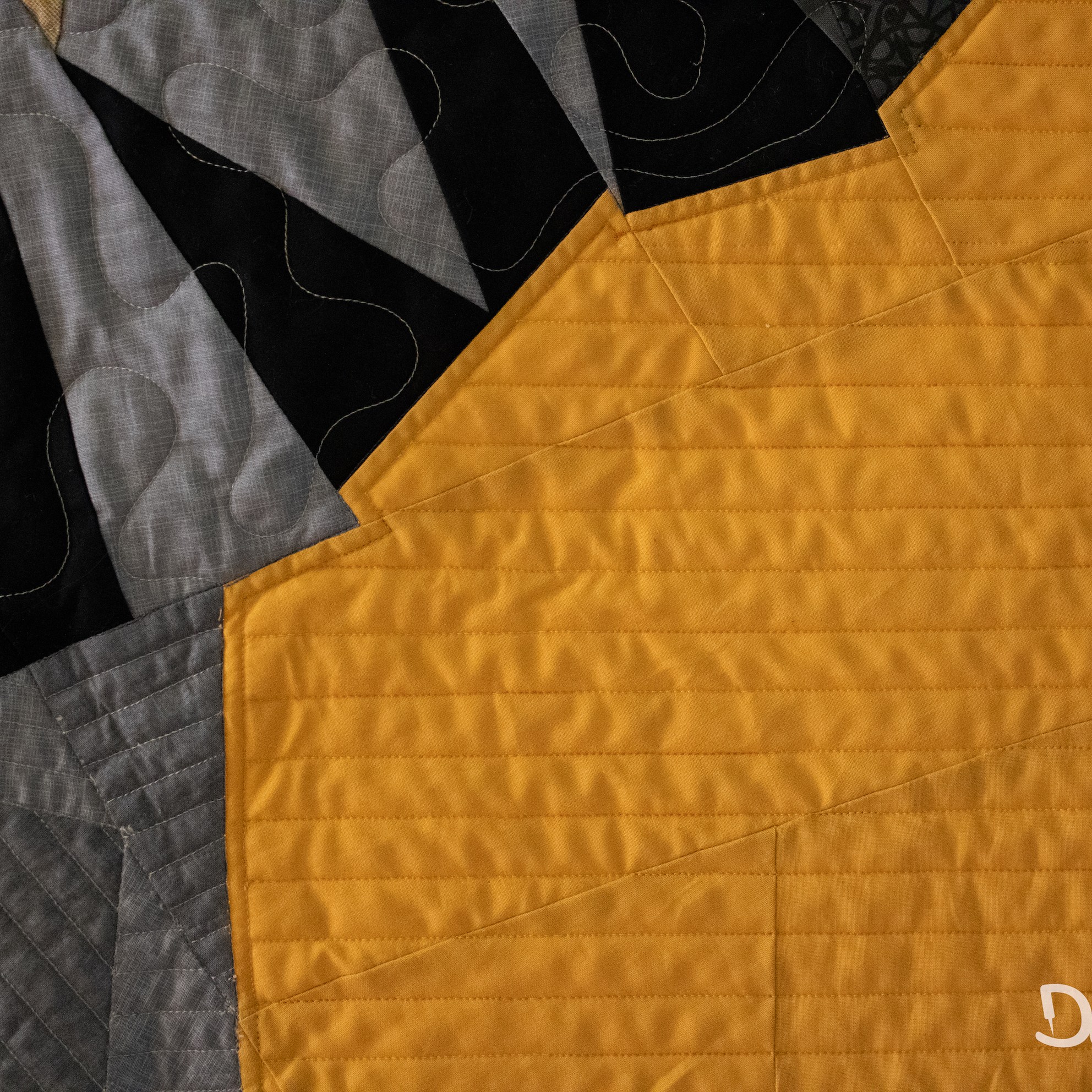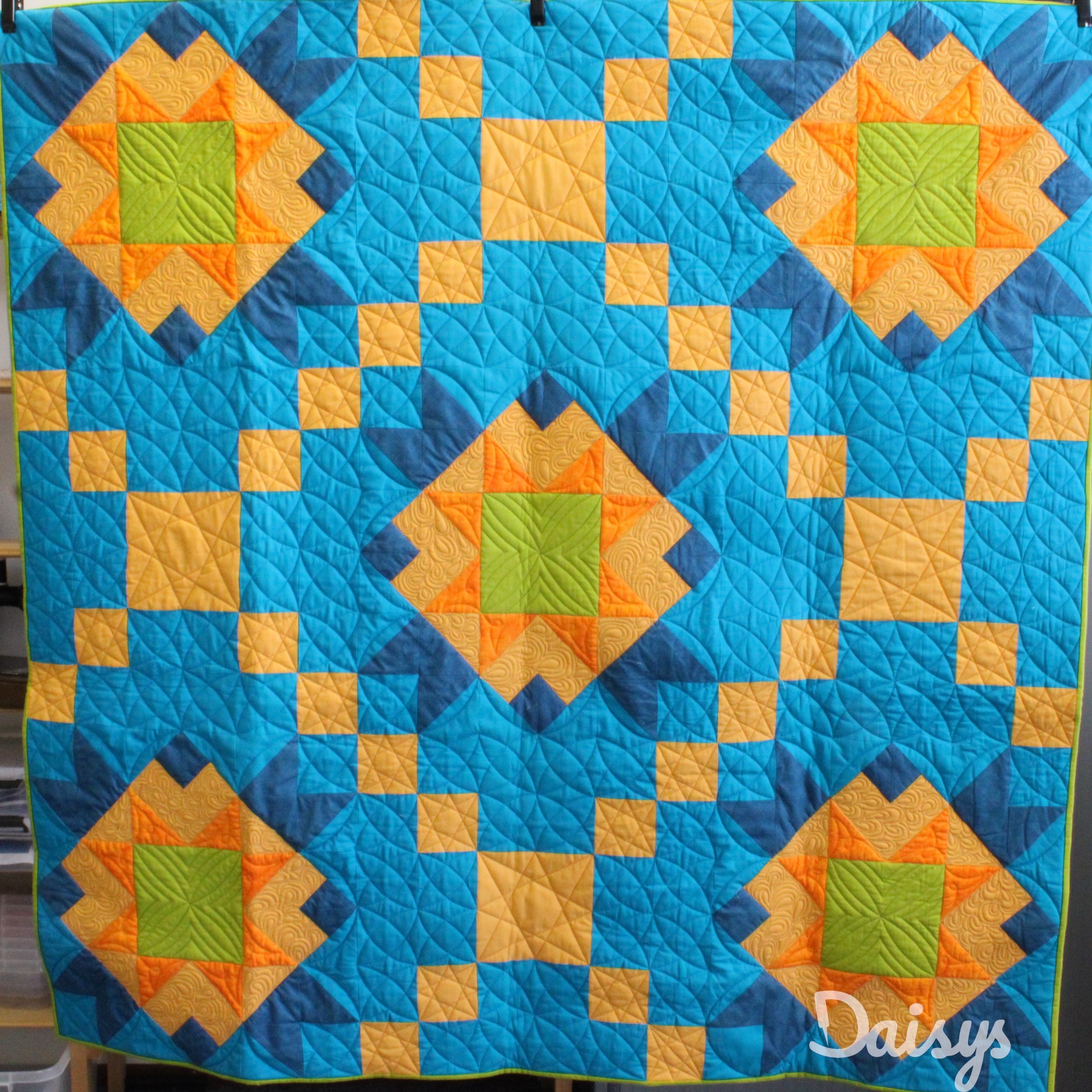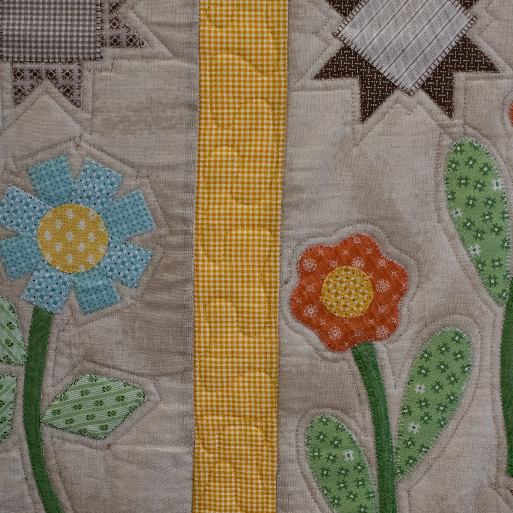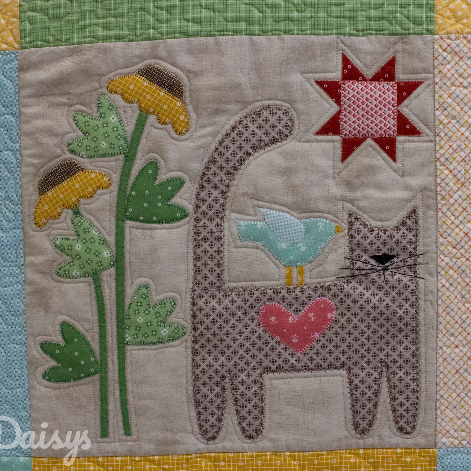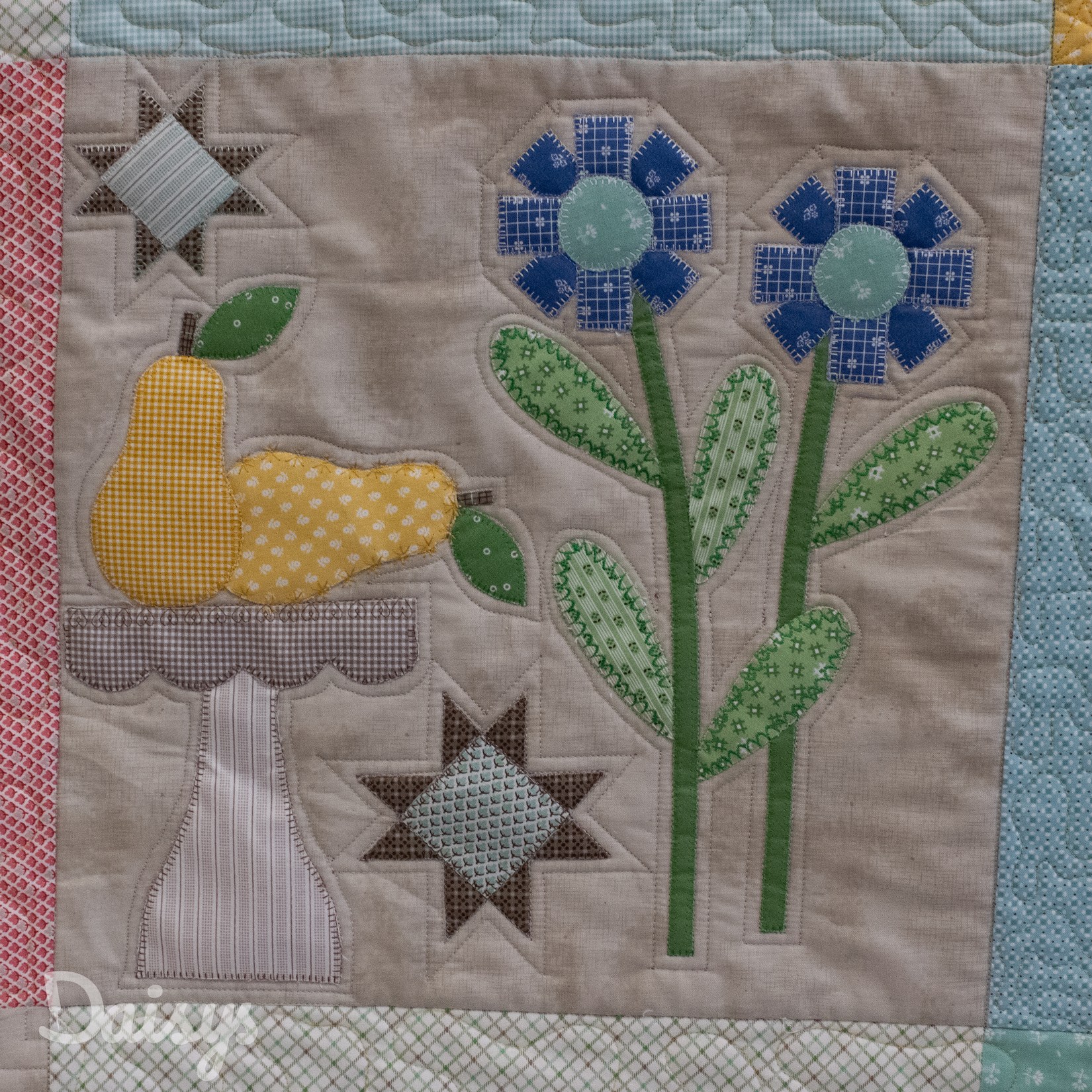 Om de applicaties te benadrukken heb ik direct om de applicaties gequilt, maar ook met een 1/4″ echo eromheen. Daarnaast heb ik in de sashings en de buitenrand een ruime meander gequilt en in de hoekblokken een echo om de ster heen. Om een klein accent te geven aan de kleine cornerstones, heb ik daar kleine sterretjes toegevoegd.