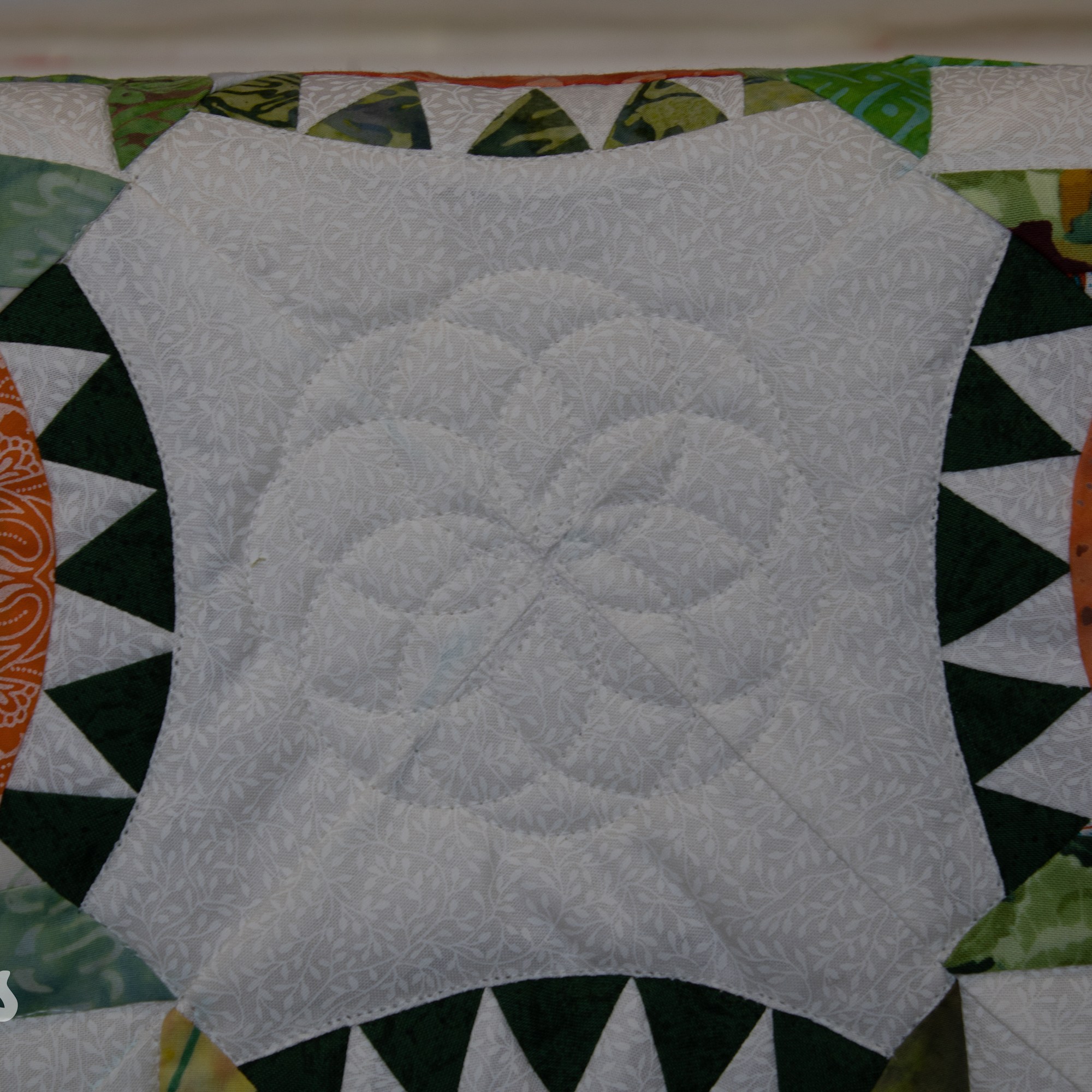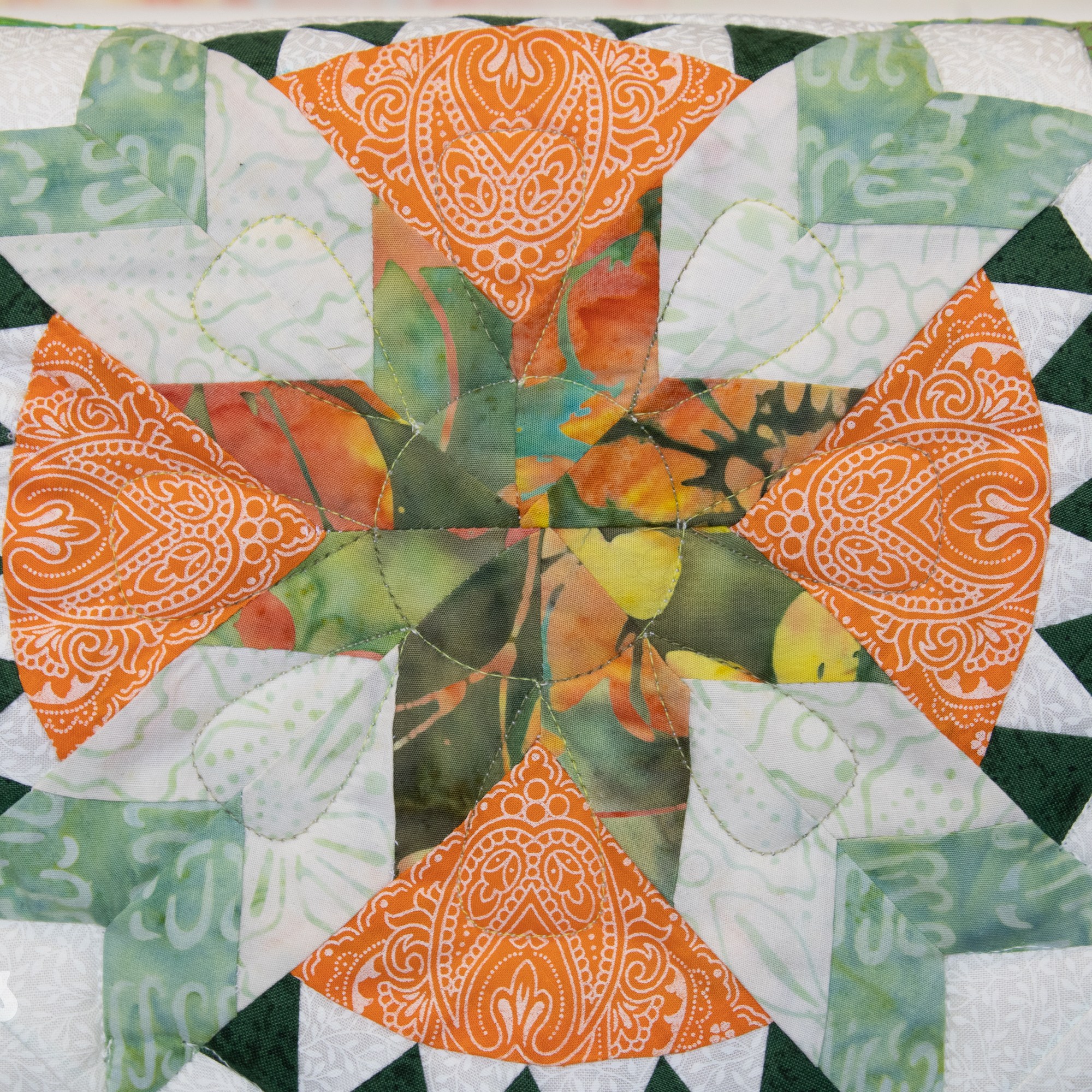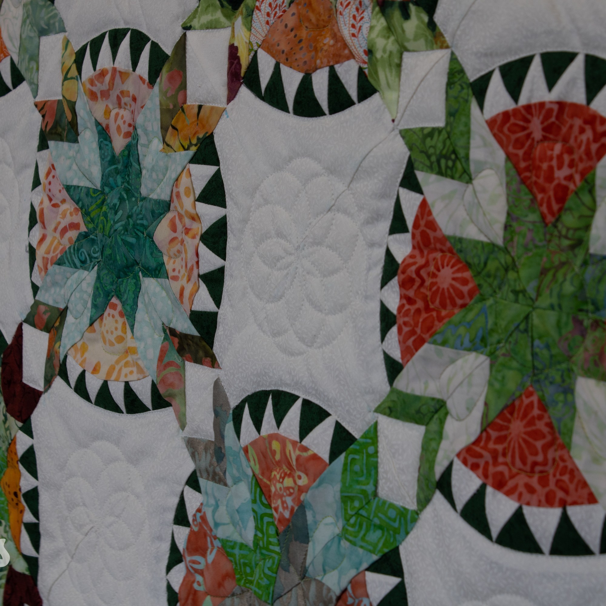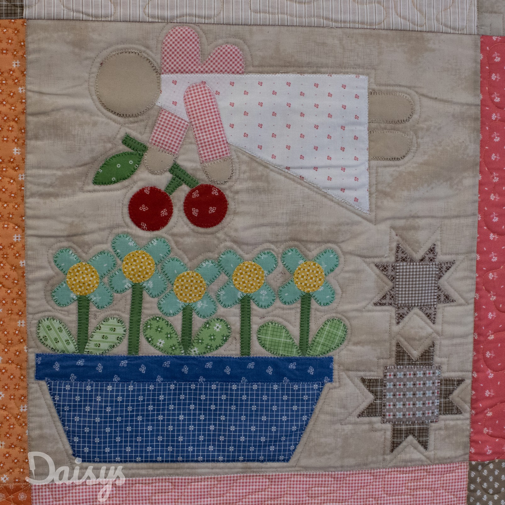 Om de applicaties te benadrukken heb ik direct om de applicaties gequilt, maar ook met een 1/4″ echo eromheen. Daarnaast heb ik in de sashings en de buitenrand een ruime meander gequilt en in de hoekblokken een echo om de ster heen. Om een klein accent te geven aan de kleine cornerstones, heb ik daar kleine sterretjes toegevoegd.