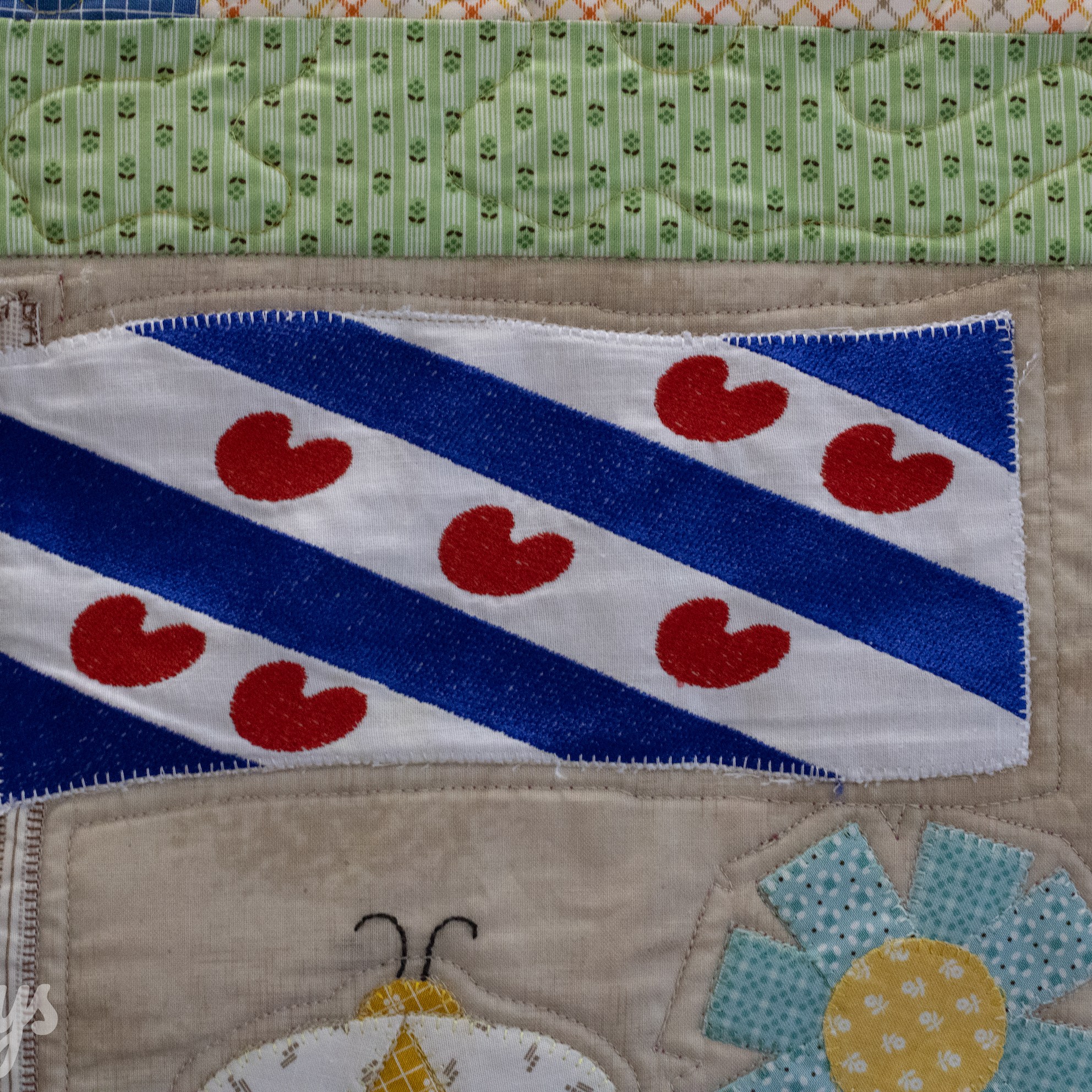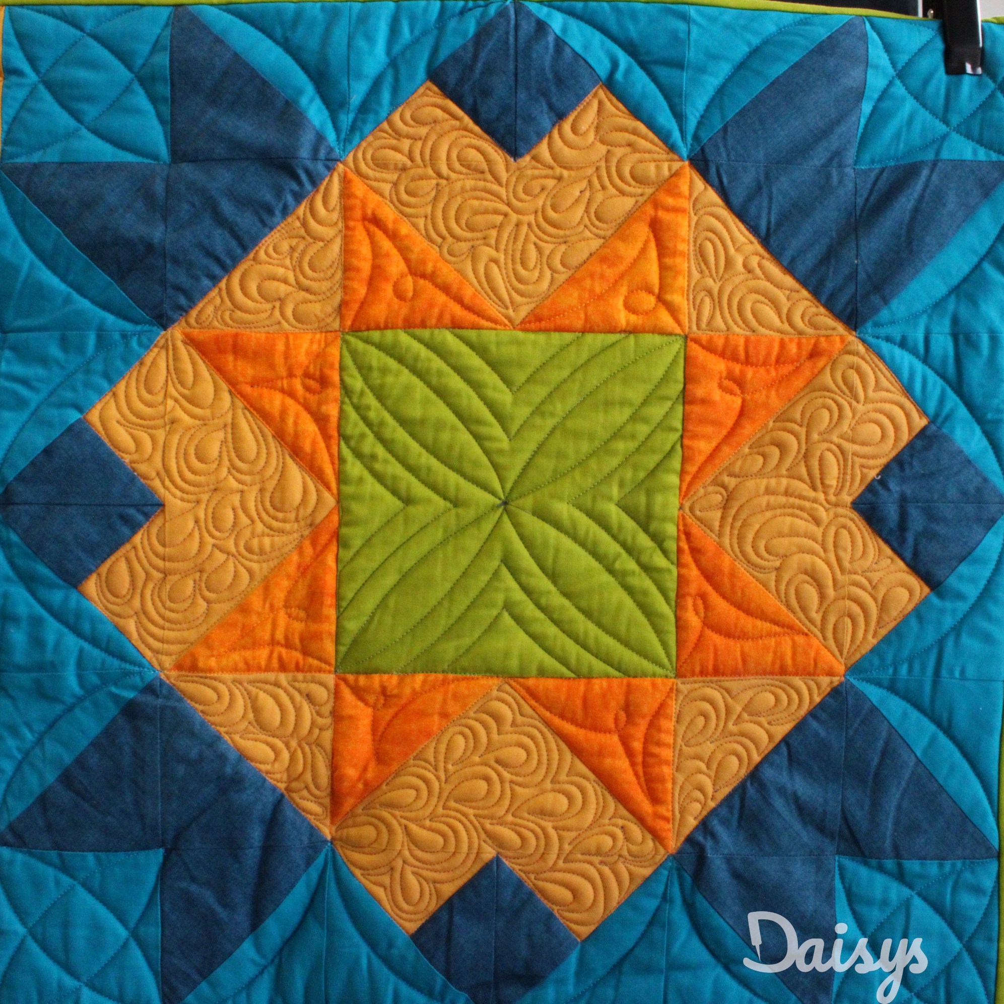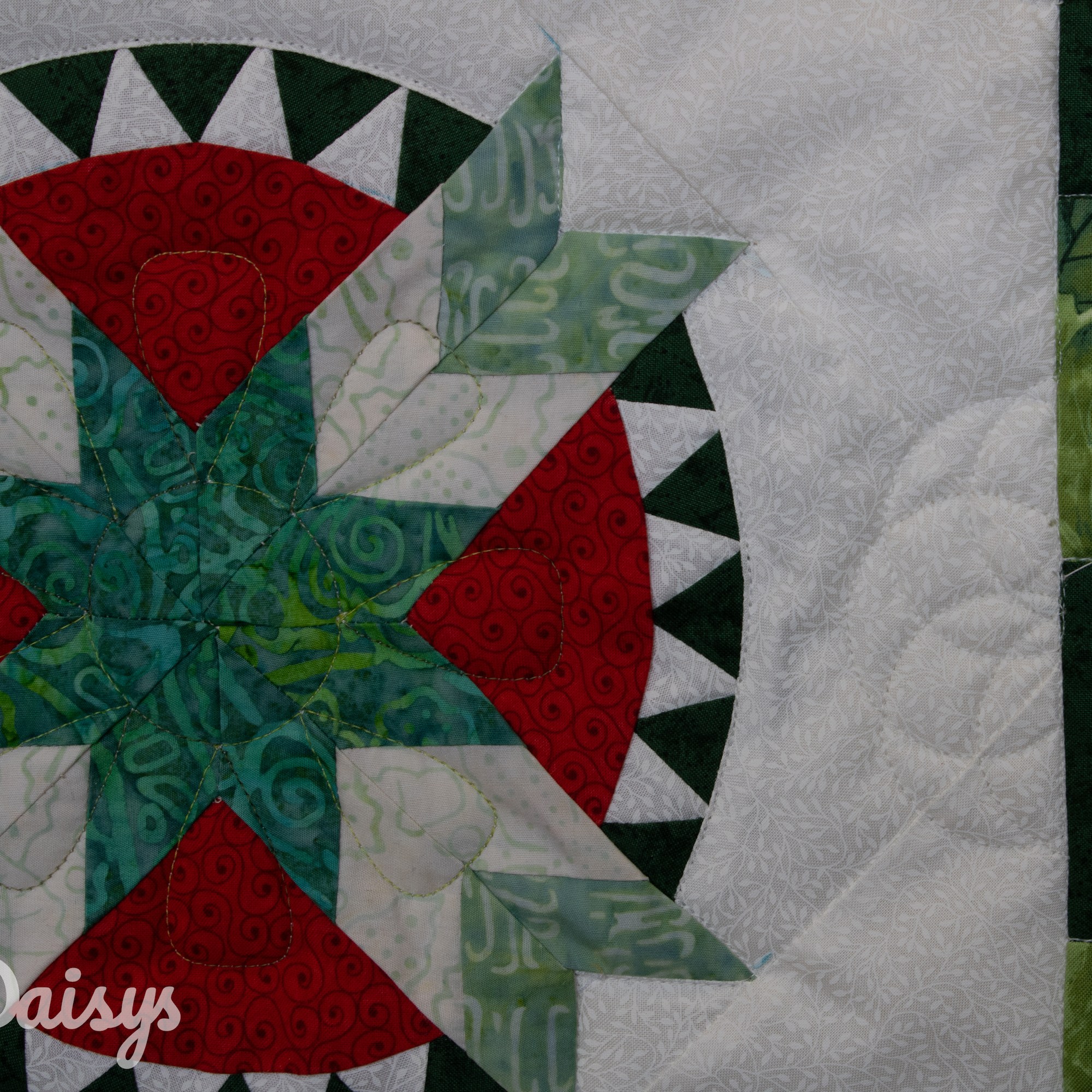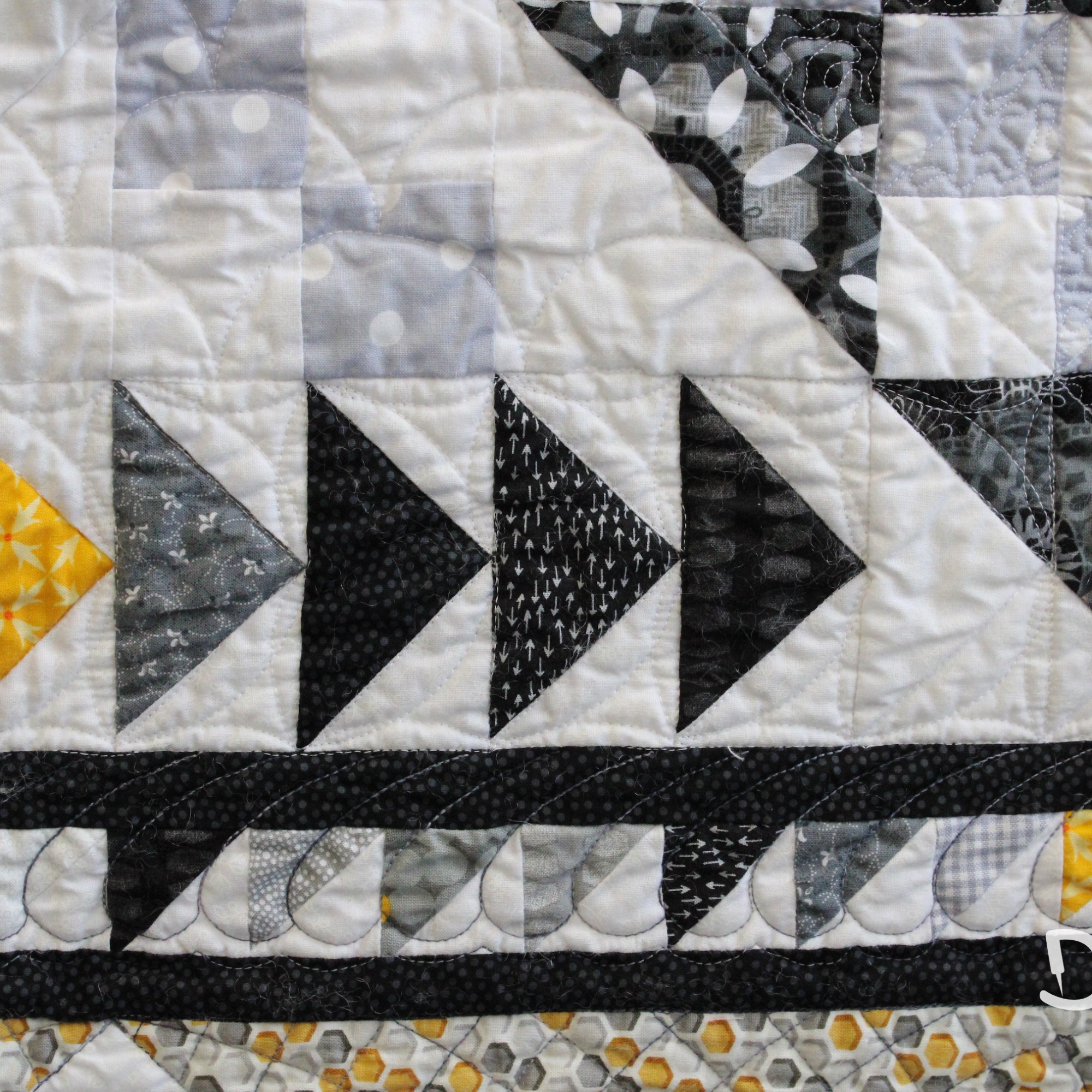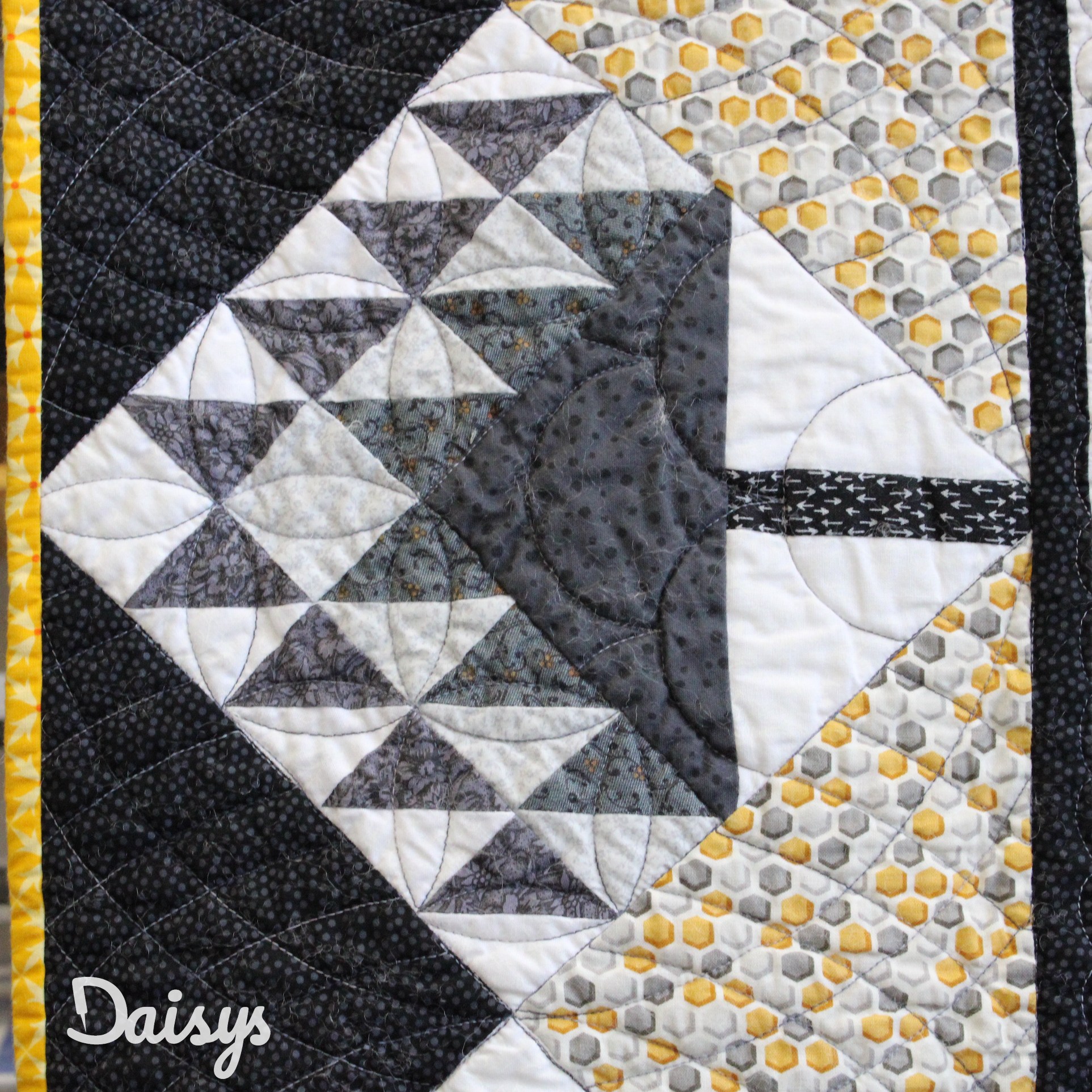 Om de applicaties te benadrukken heb ik direct om de applicaties gequilt, maar ook met een 1/4″ echo eromheen. Daarnaast heb ik in de sashings en de buitenrand een ruime meander gequilt en in de hoekblokken een echo om de ster heen. Om een klein accent te geven aan de kleine cornerstones, heb ik daar kleine sterretjes toegevoegd.