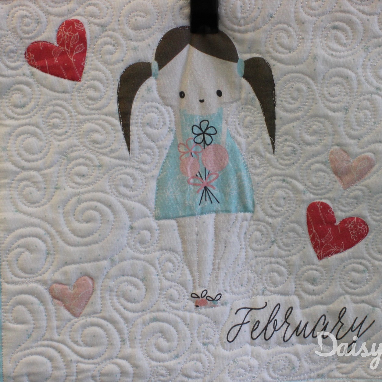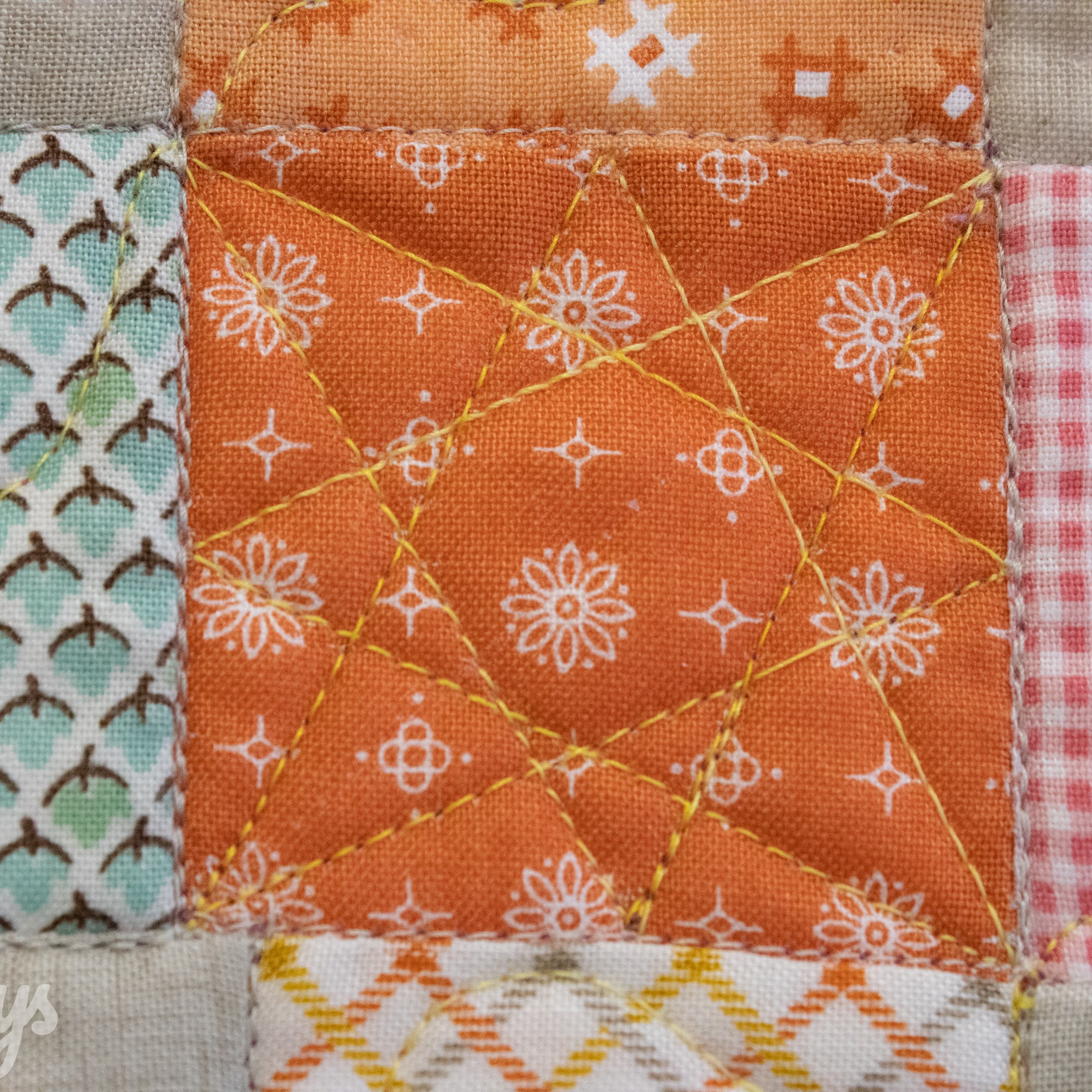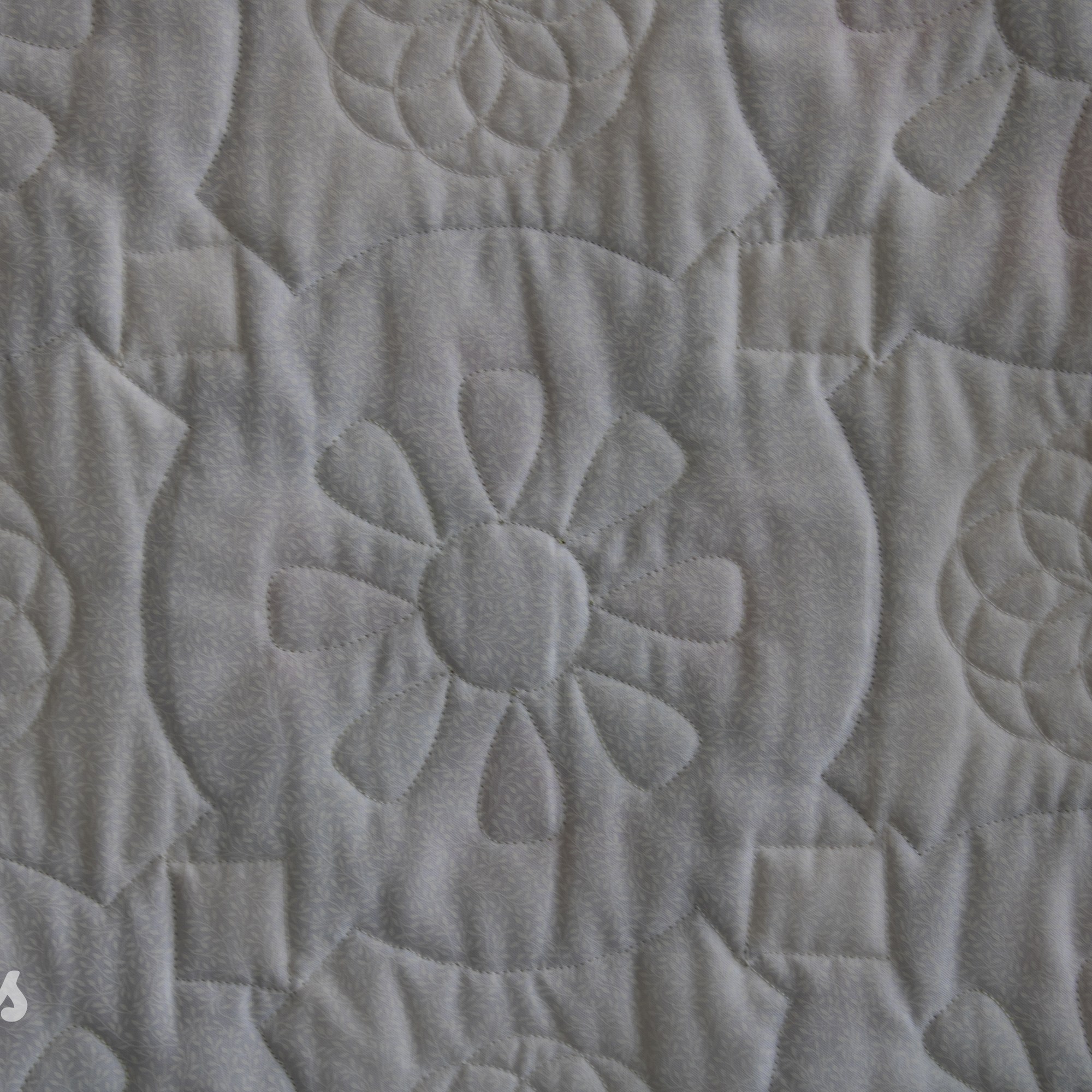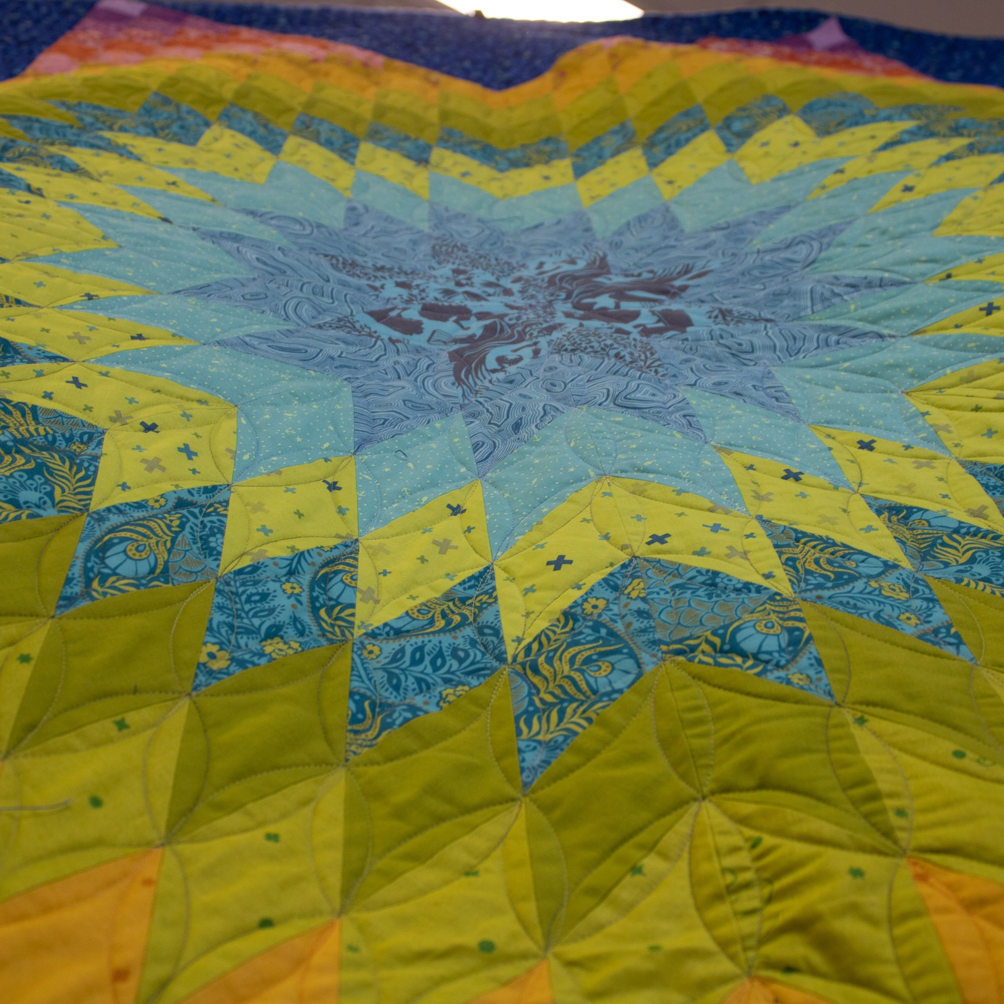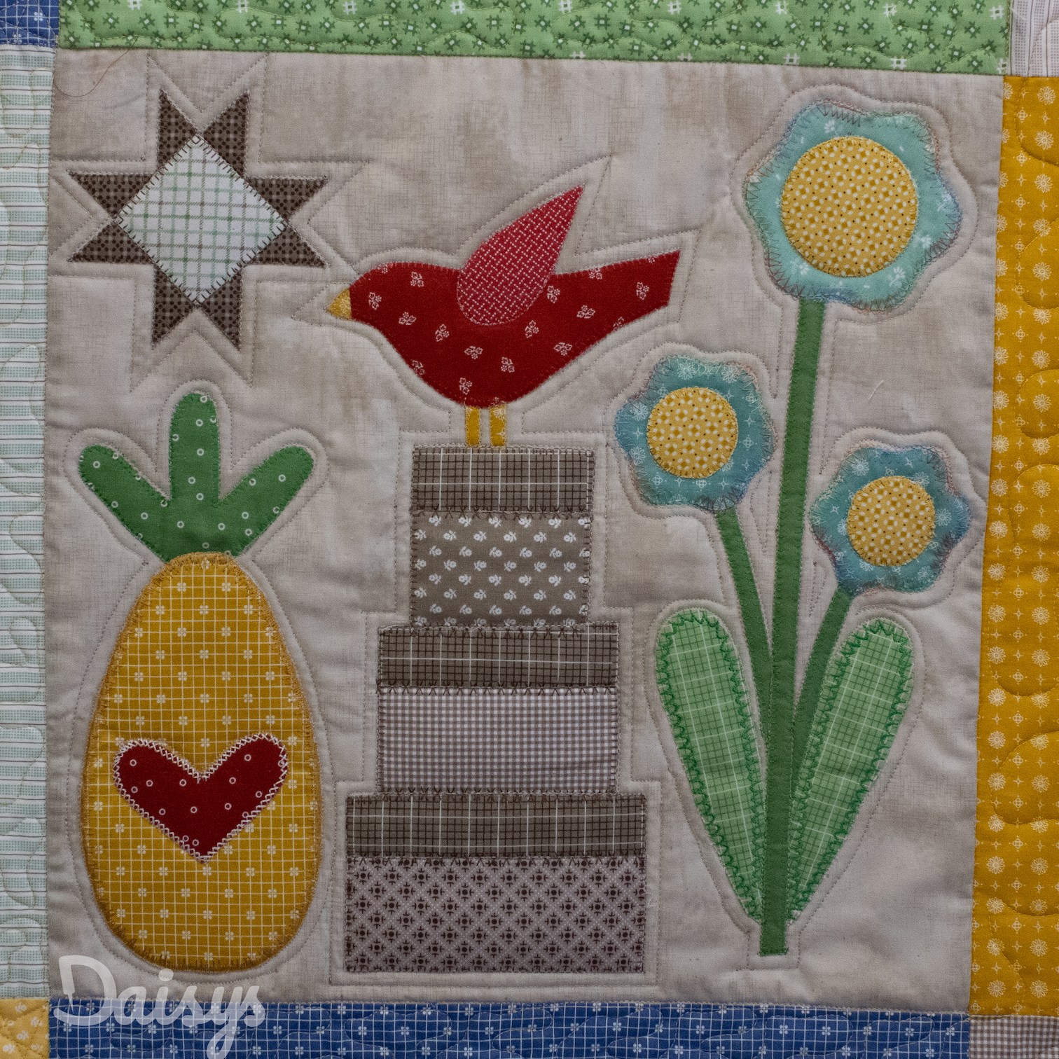 Om de applicaties te benadrukken heb ik direct om de applicaties gequilt, maar ook met een 1/4″ echo eromheen. Daarnaast heb ik in de sashings en de buitenrand een ruime meander gequilt en in de hoekblokken een echo om de ster heen. Om een klein accent te geven aan de kleine cornerstones, heb ik daar kleine sterretjes toegevoegd.