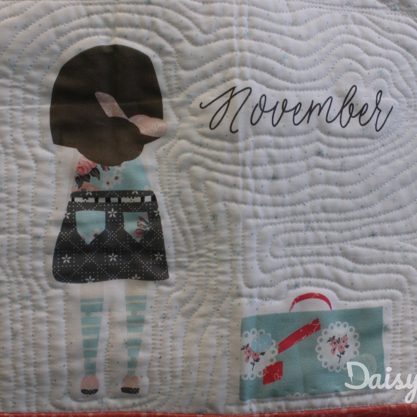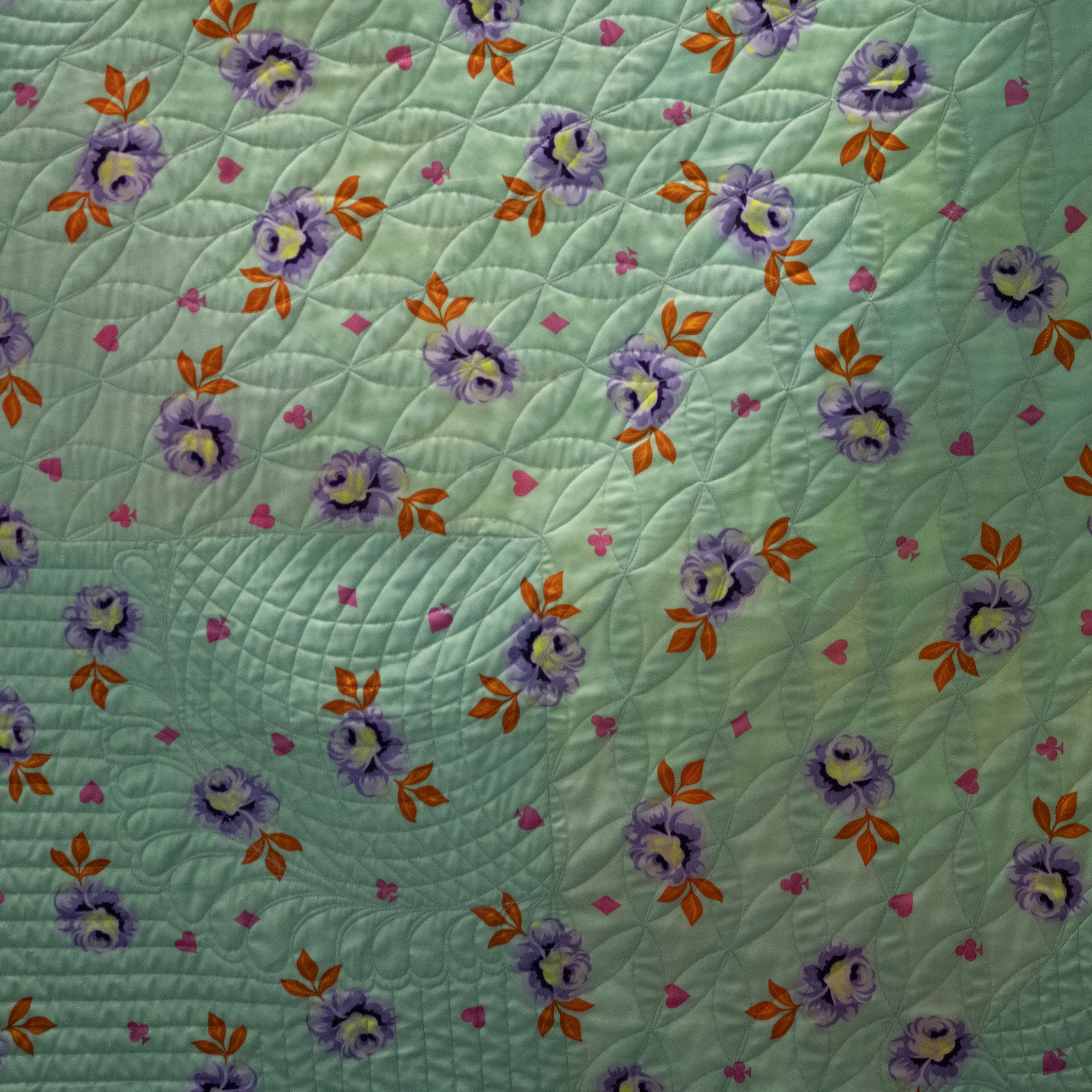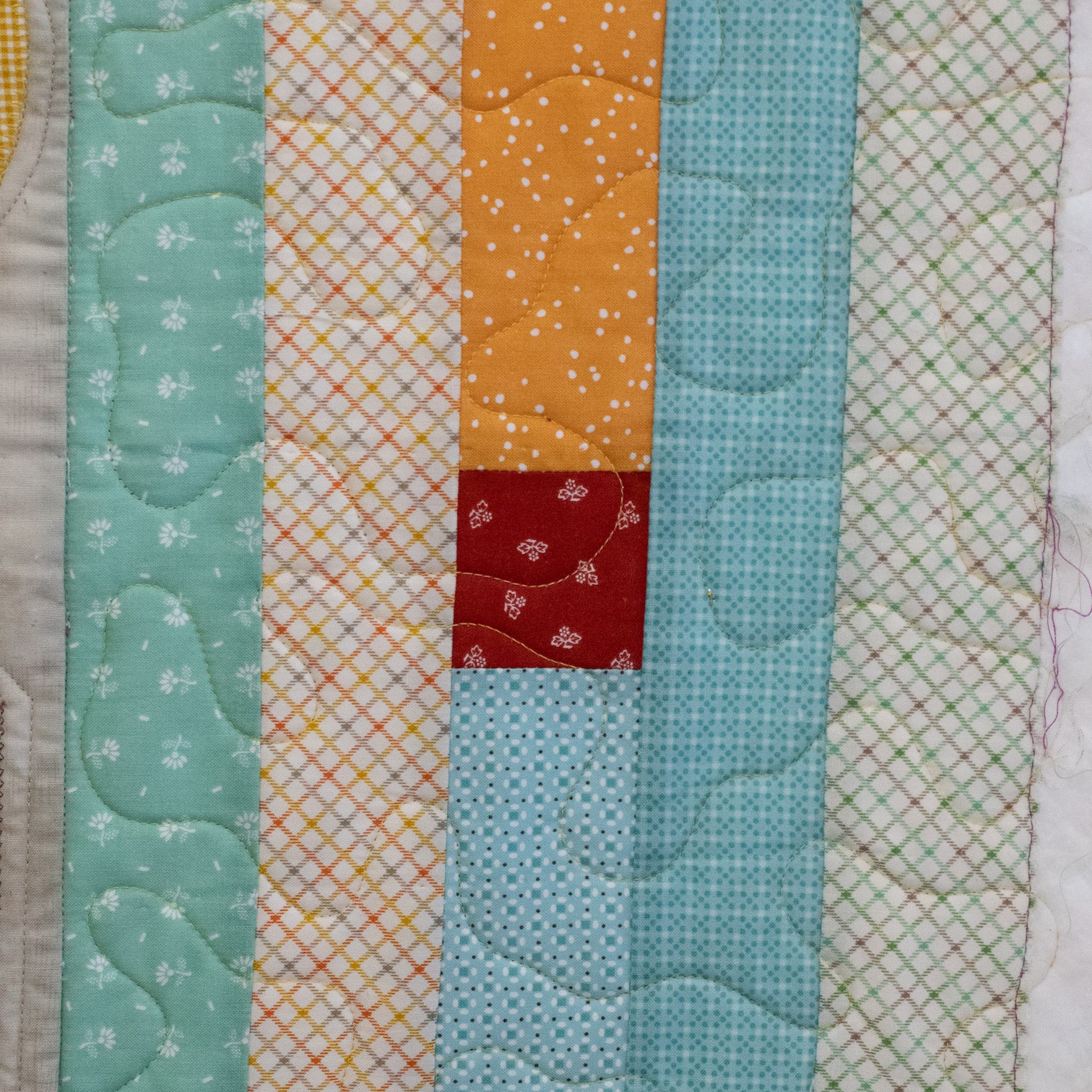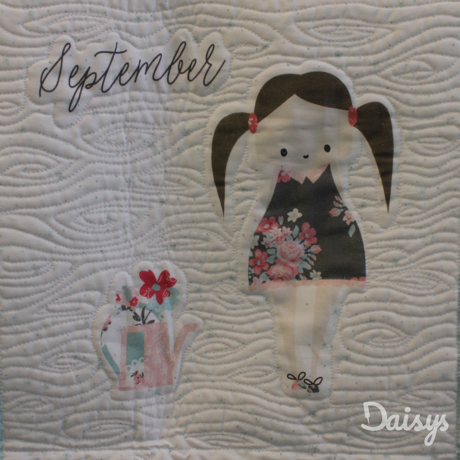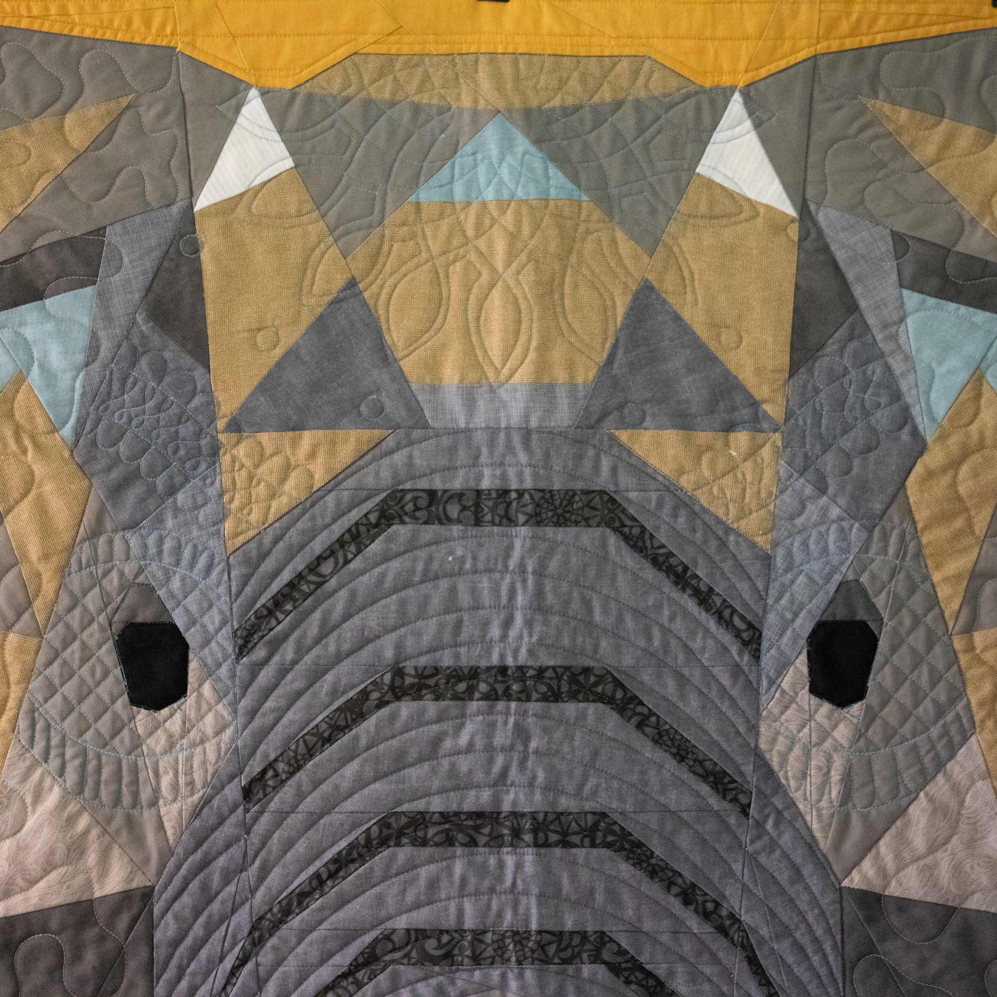 Om de applicaties te benadrukken heb ik direct om de applicaties gequilt, maar ook met een 1/4″ echo eromheen. Daarnaast heb ik in de sashings en de buitenrand een ruime meander gequilt en in de hoekblokken een echo om de ster heen. Om een klein accent te geven aan de kleine cornerstones, heb ik daar kleine sterretjes toegevoegd.