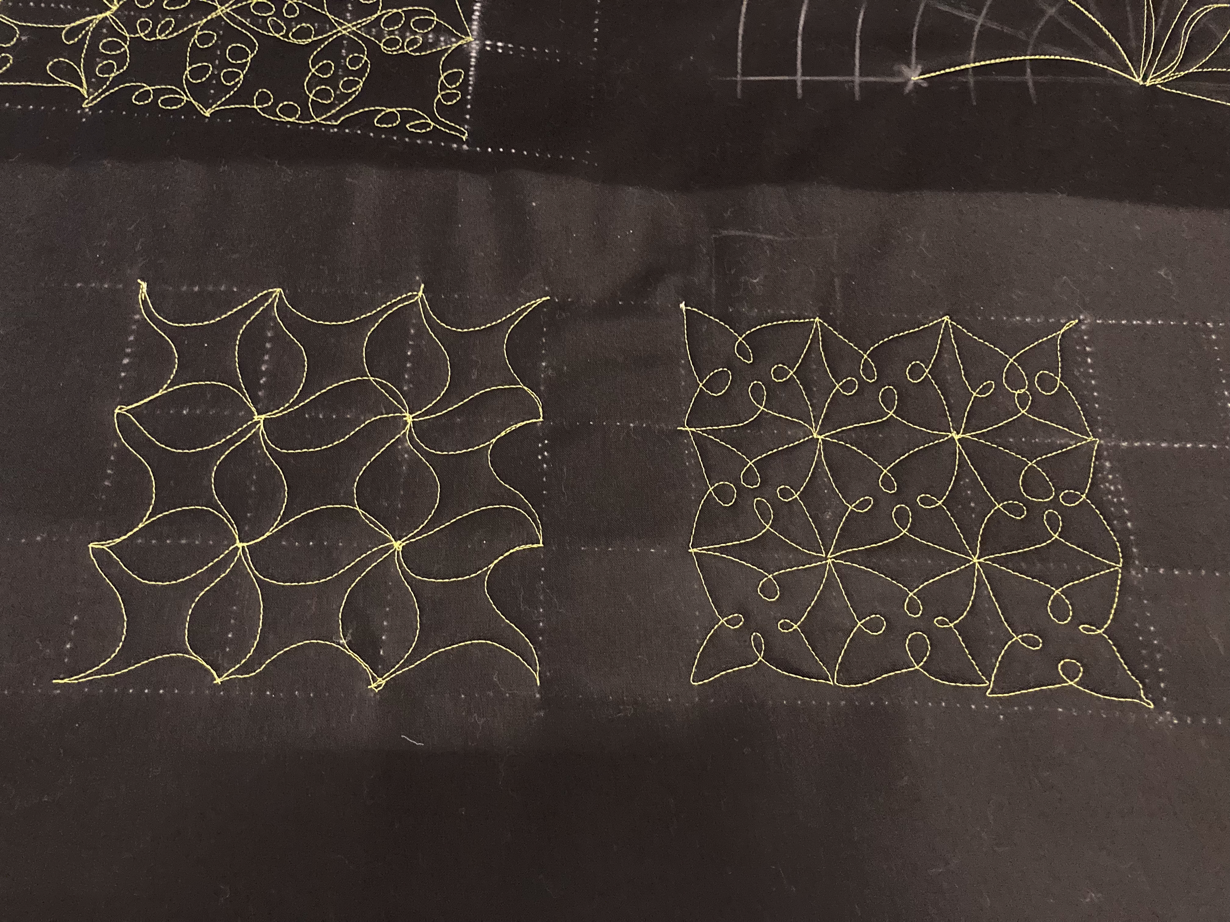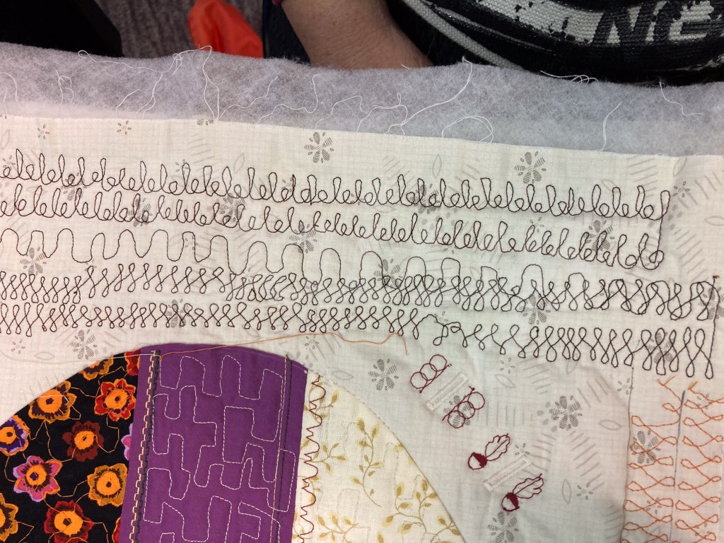 Er is zelfs al geoefend op een quilttop…… op een proeflap…… en nog één…… én op het oefenpaneel van de cursus.