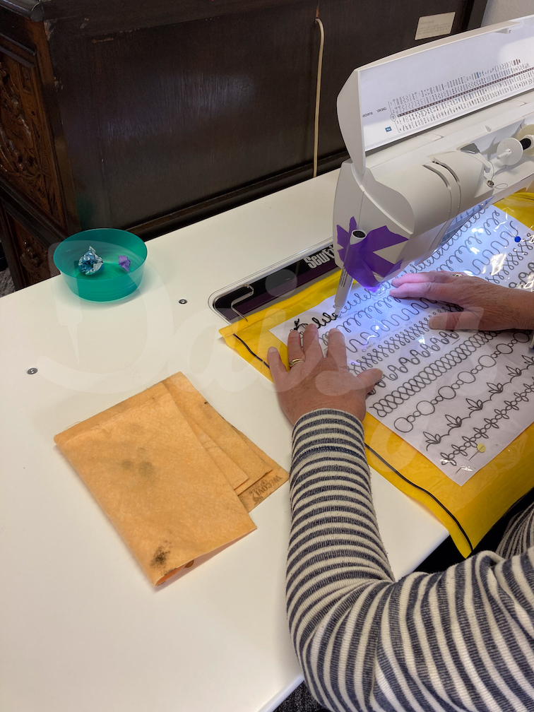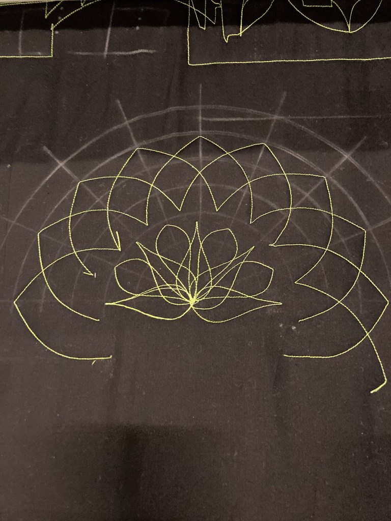 Na een korte uitleg over de Jade-rulers, mochten we aan het werk op de longarm en ging ik in stappen bezig met het ontwerpen van een mandala.