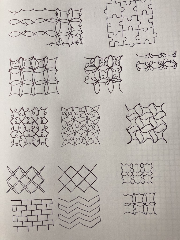 Iedereen heeft elkaars werk bewondert om vervolgens te beginnen met de rasterpatronen. Er zijn zoveel verschillende mogelijkheden bij deze patronen, dat het deze les zelf ontwerpen is. Dus met het werkblad met raster aan de slag en tekenen maar op een vierkant raster…