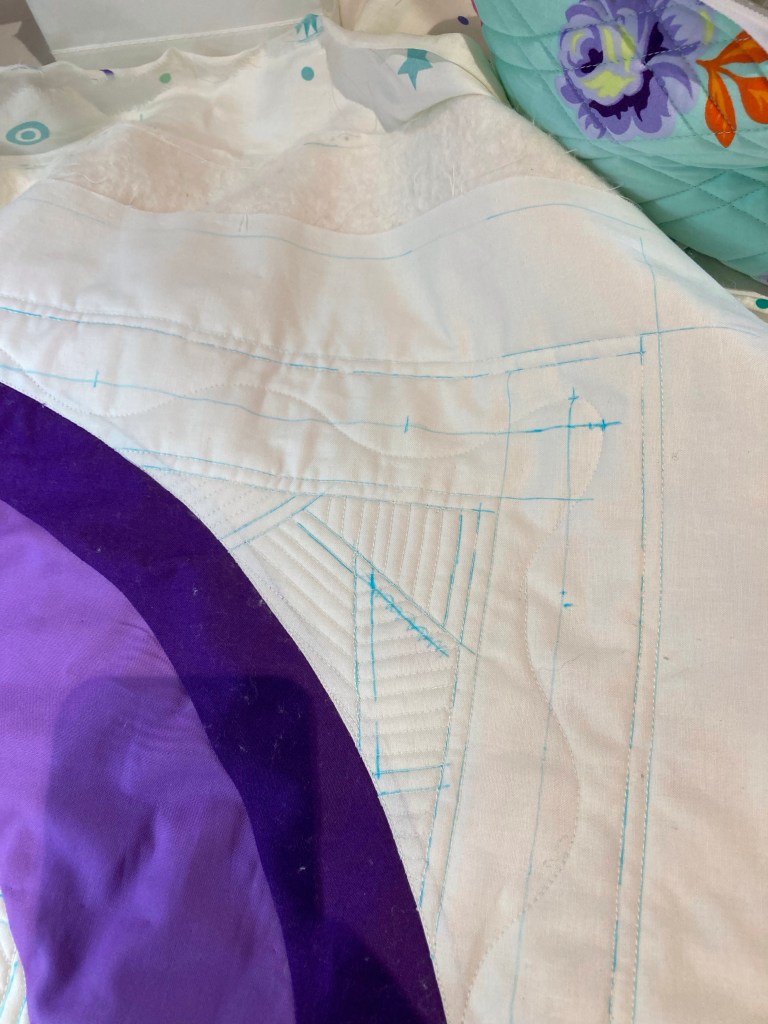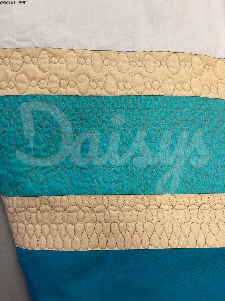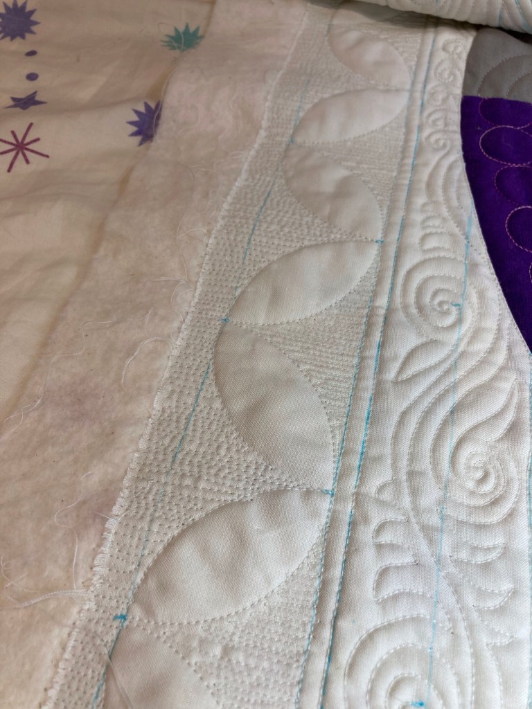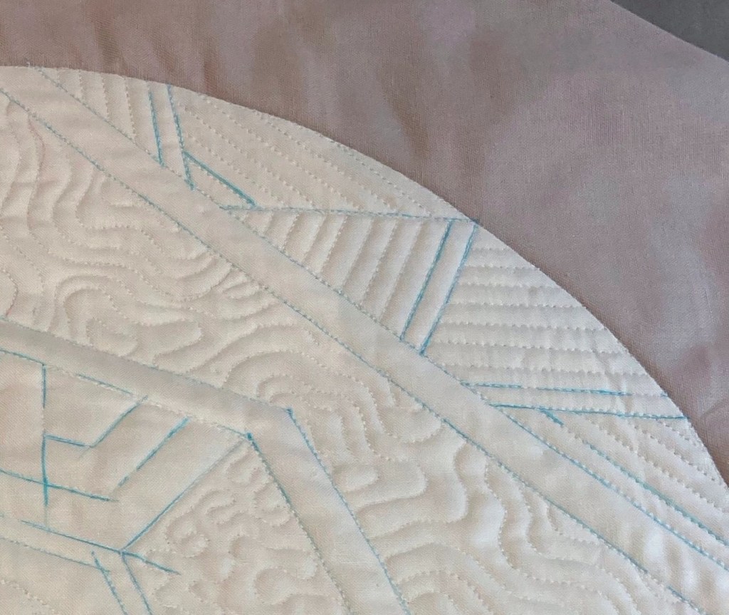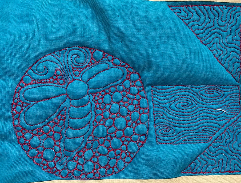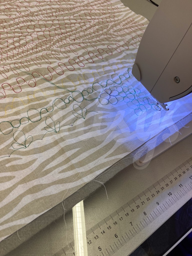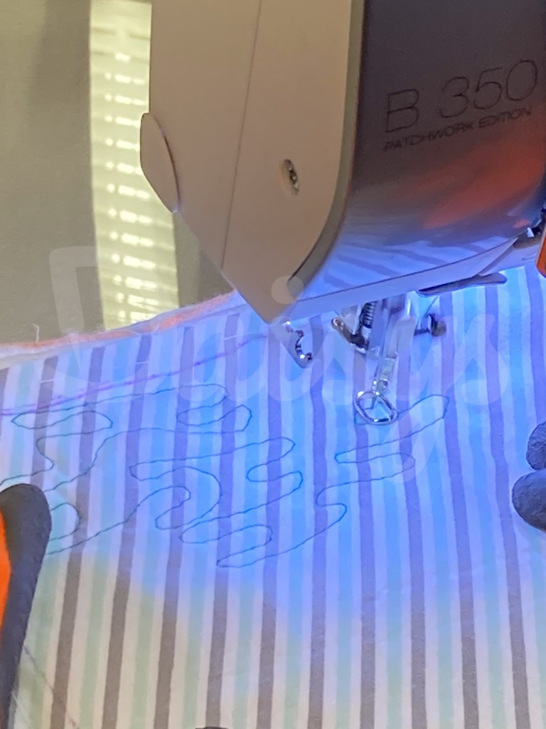 Eerste de rand met de golven. Deze heb ik gequilt met een liniaal, om vervolgens de rest op te vullen met freemotion.