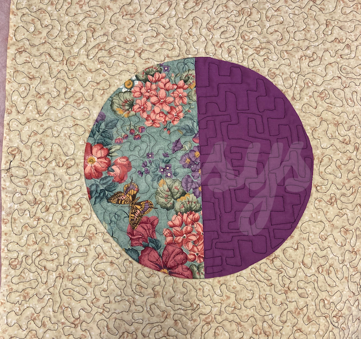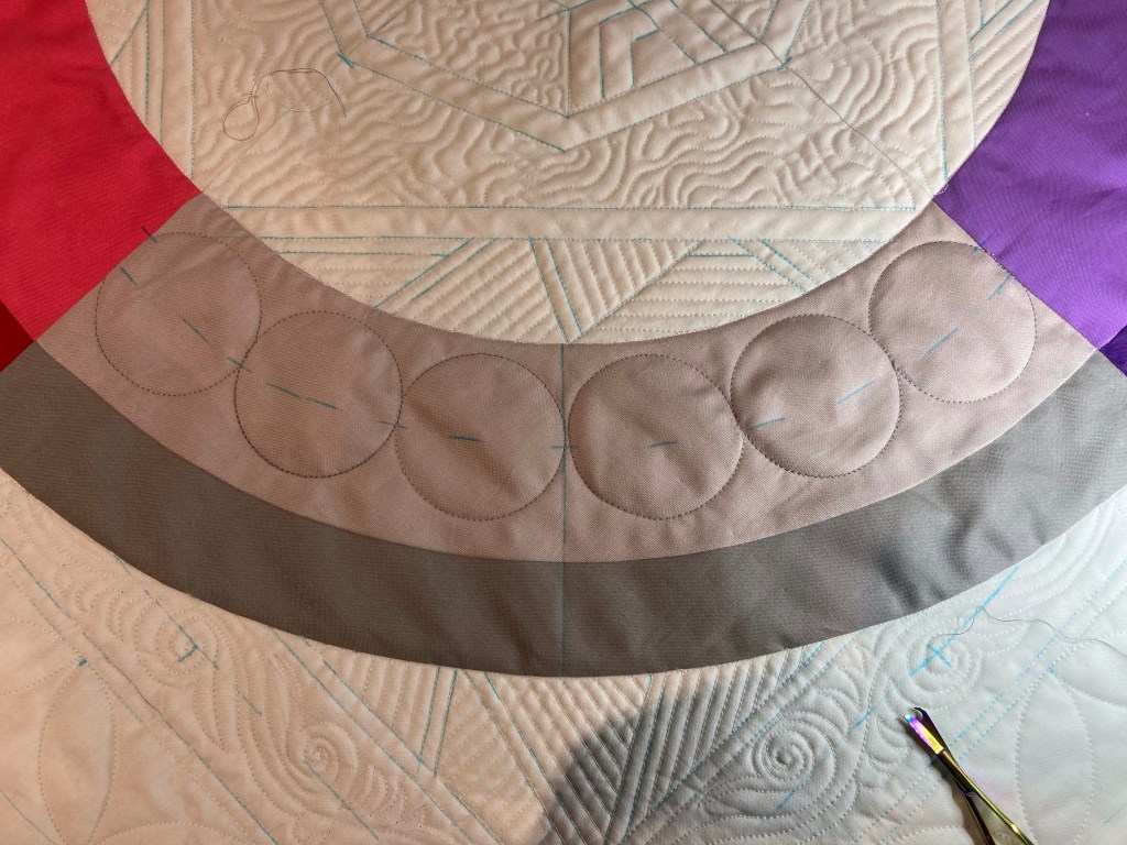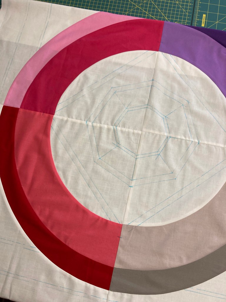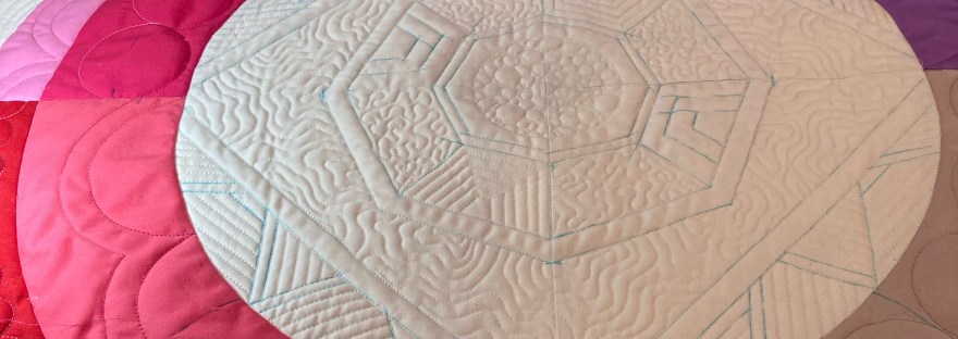 En dan is het eindelijk tijd voor de gekleurde cirkel. Cirkels in de rondte patchen is al niet makkelijk, maar quilten is ook niet iets wat je zo doet. Je moet er bij nadenken…