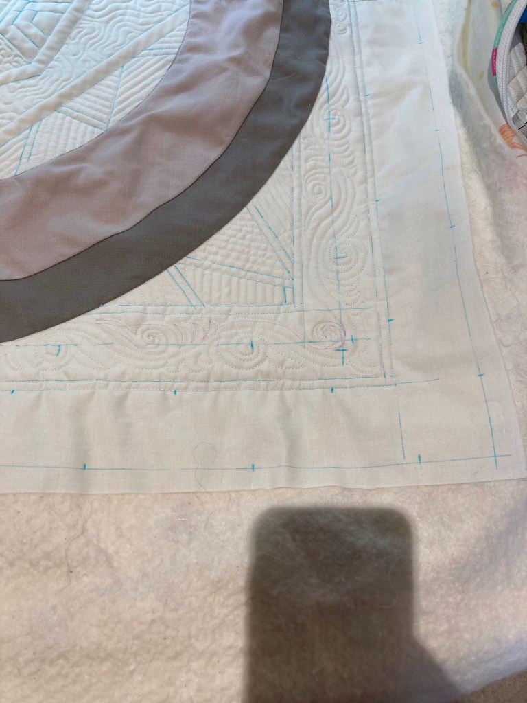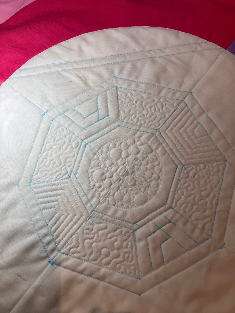 Nog een echorandje quilten en toen zat de ochtend er helaas alweer op. De throatspace op de longarm waar ik op quiltte was helaas niet groot genoeg om de mandala rond te maken, maar ik heb wel een goed beeld gekregen van de mogelijkheden van de rulers.
