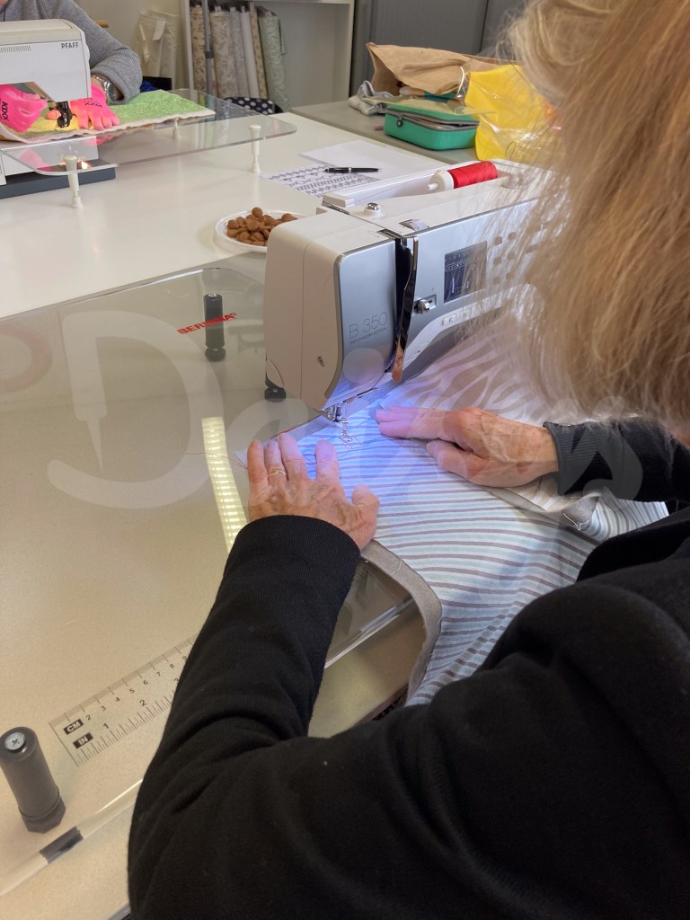 De ene heeft een wat groter werkruimte als de ander, maar het gaat eigenlijk al super goed! De dames gaan dus snel over op het oefenen op de stof. De proeflappen worden erbij gehaald en de eerste steekjes worden gezet.