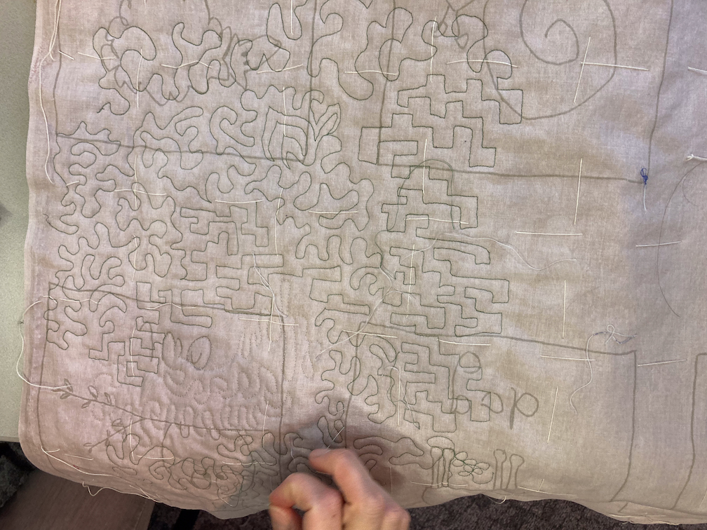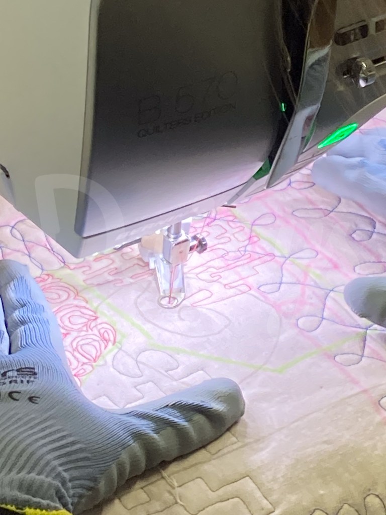 Tegen een uur of tien is het dan tijd om te beginnen met het quilten. Netjes over de lijnen, zodat de quilt gestabiliseerd wordt.