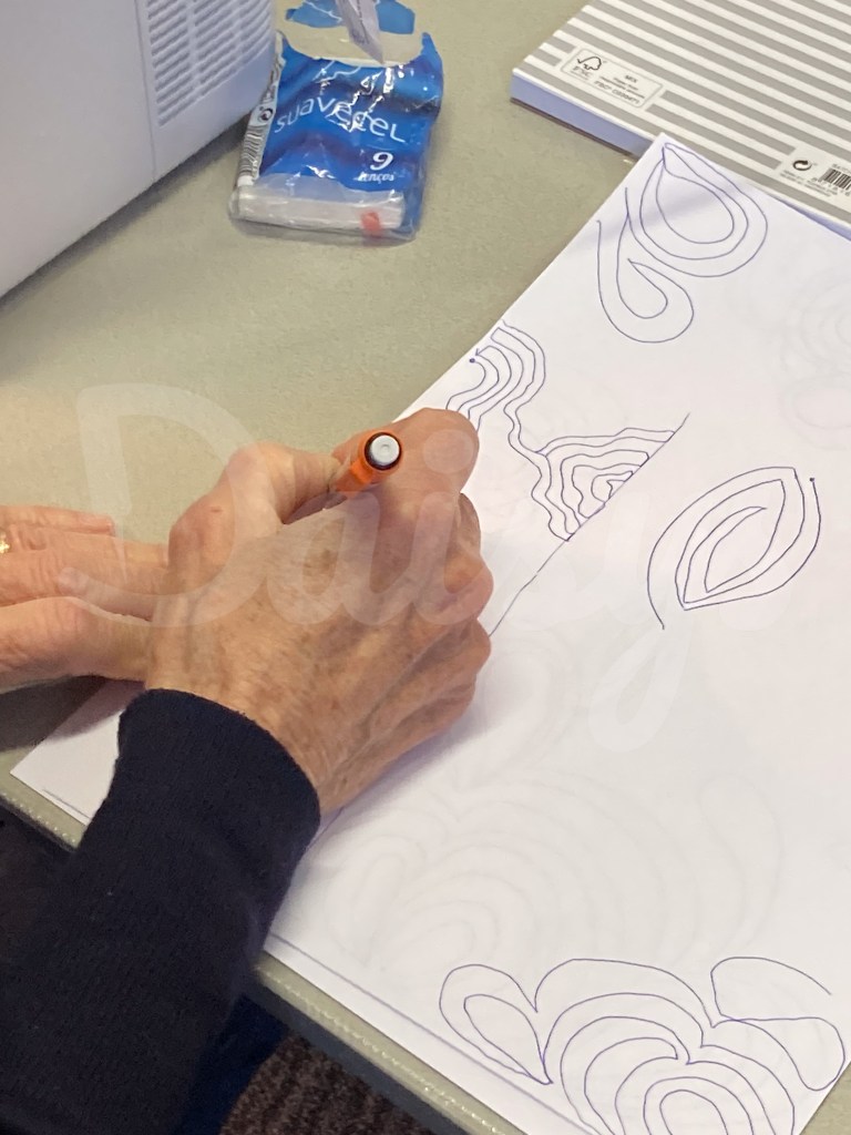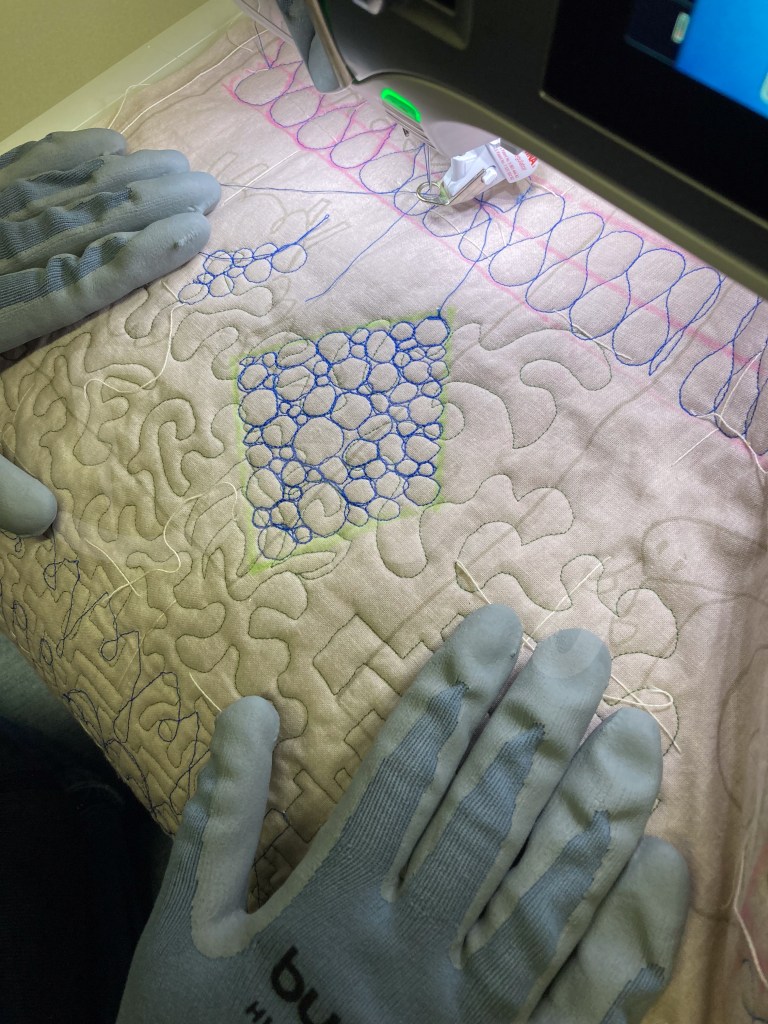De dag stond helemaal in het teken van quilten op de longarm. ’s Ochtends werken met rulers en het maken van een mandala en ’s middags bezig met freemotion quilten en grid work.