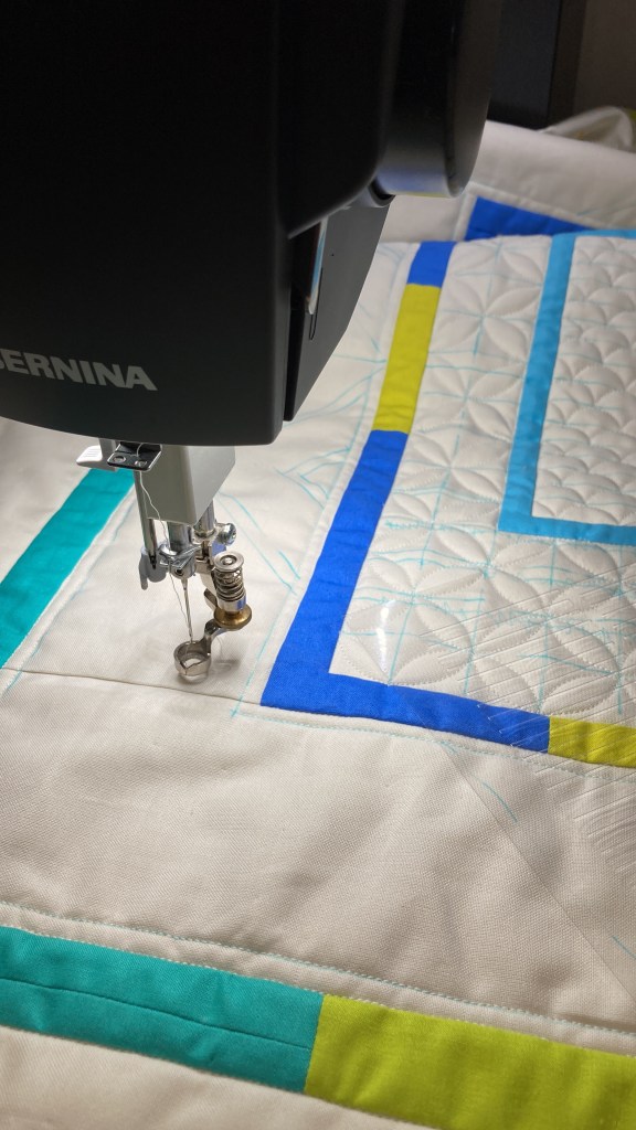 Daarna gaat het verder met de fingerprint…. (Niet nadenken, maar gewoon quilten 😉) In mijn gedachte tijdens het quilten …. 🎶 just keep swimming, just keep swimming….