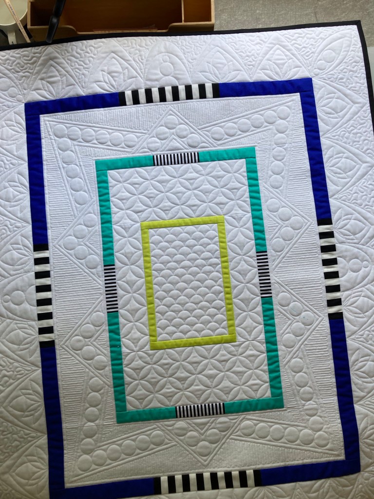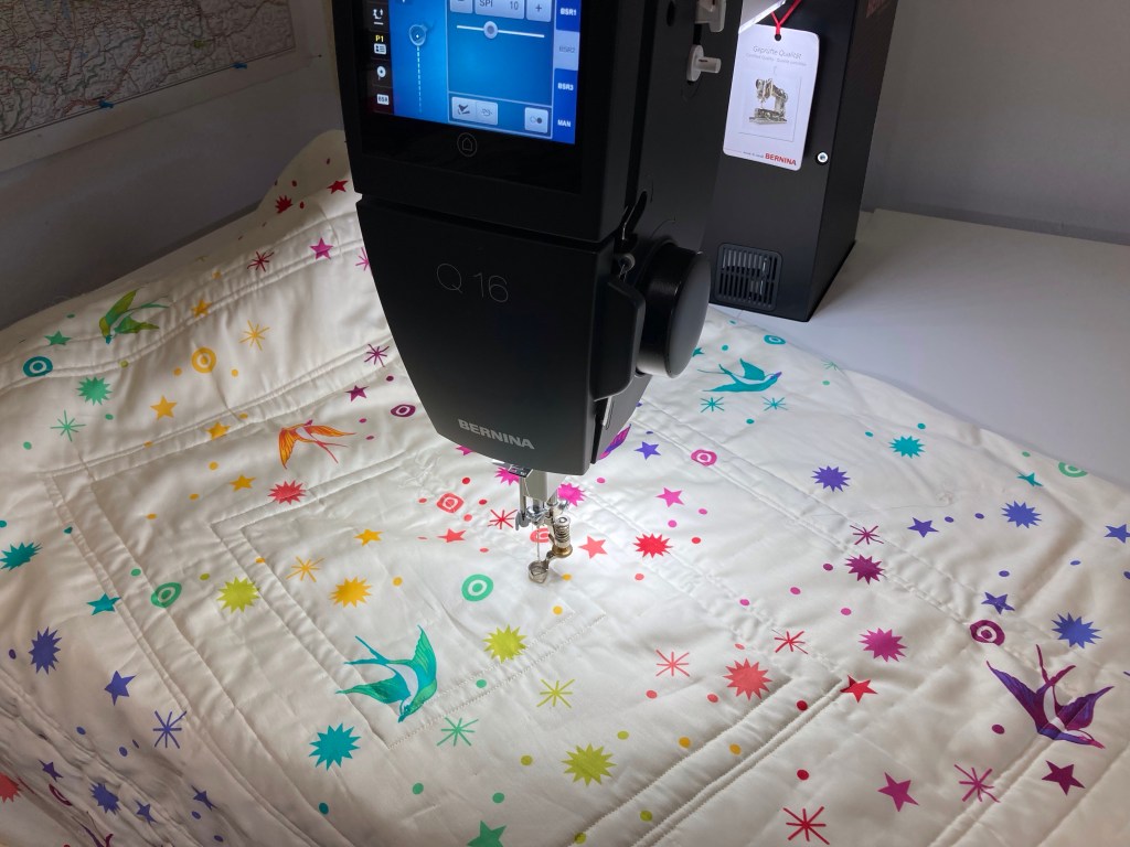 Na 1.19 uur was ik eindelijk klaar met het quilten van de buitenste rand 🥵. Maar het resultaat mag er wezen, al zeg ik het zelf….