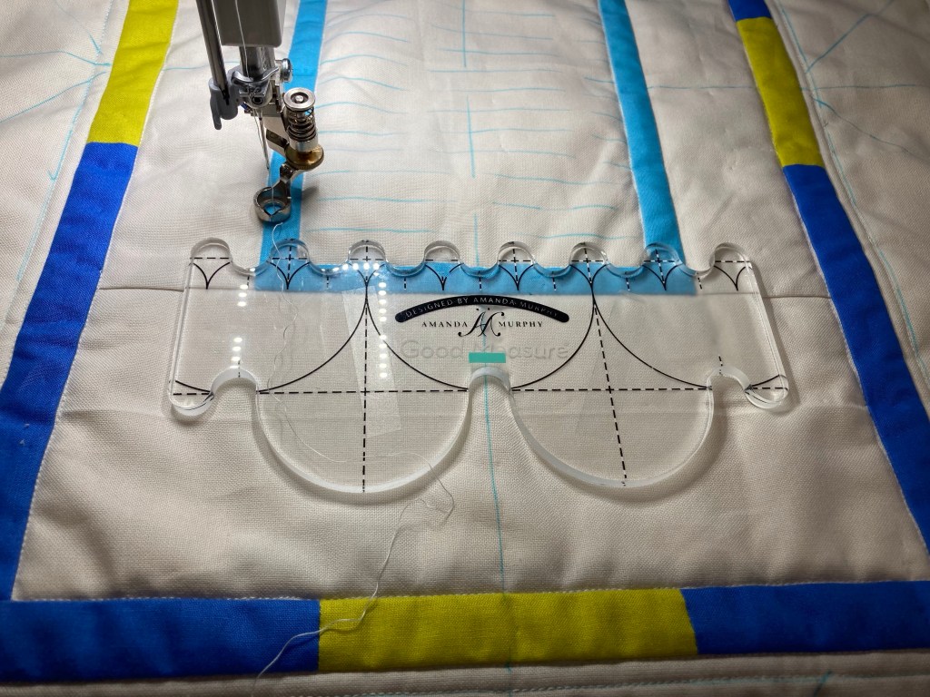 Ik zit deze twee dagen achter de Sit-down Longarm en daarom werk ik vanuit het midden. Ik moet dus beginnen met de clamshells. Hulplijnen tekenen en gaan met die banaan!