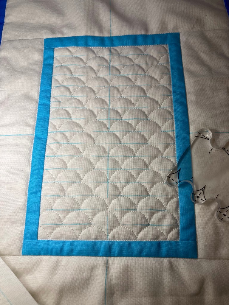 Eerste de rand met de golven. Deze heb ik gequilt met een liniaal, om vervolgens de rest op te vullen met freemotion.