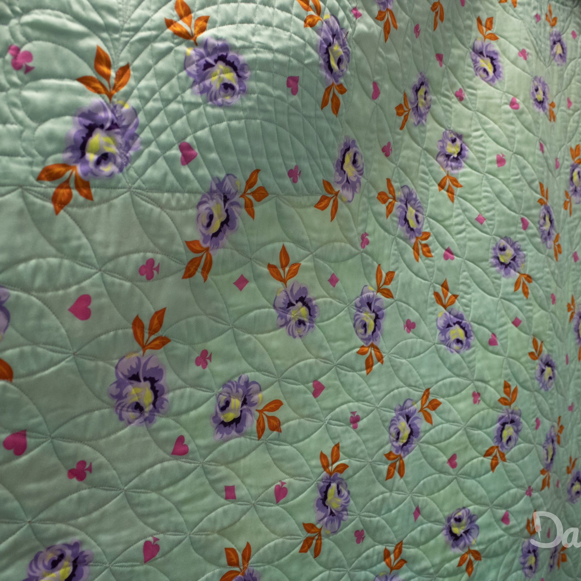 Het garen valt zo mooi weg in de stof, je ziet alleen het reliëf van het quilten maar. Het garen speelt niet de hoofdrol.