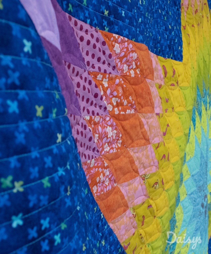 Naast de voorkant van de quilt is de achterkant ook heel mooi. Magda koos voor de dubbelbrede stof van Tula Pink van de stofcollectie Curiouser & Curiouser. Hierop zie je aan de achterkant ook het quiltwerk heel mooi.